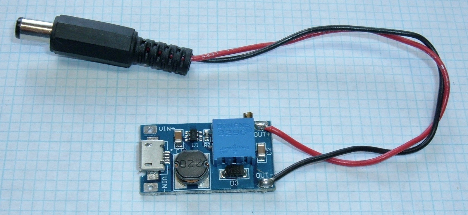 But, just to be safe (while testing), I’m powering this from 12V. I have a bunch of these little boost converters ($2 on eBay) that have a micro USB port on them, and I love them for this sort of work. I’m using one to power my DSO138 oscilloscope, I use them for these devices… they work perfectly for anything that doesn’t draw much power and needs an input voltage around 12V. Having everything in my office be USB powered is sort of awesome, and it also means that I can easily use my equipment on the go with a USB battery pack.