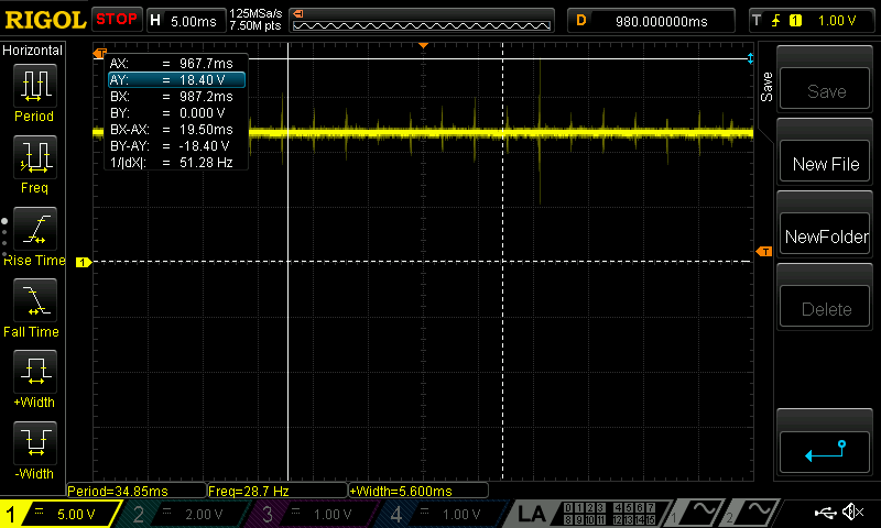 And it does this a ton. These ringing spikes are very, very frequent when it’s operating wide open. On this trace, the time unit is set to 5ms - so each line, horizontally, is 5ms. You can see it’s getting that ringing very regularly, with some of them quite high. I don’t have exact values for the frequency, but it’s a problem - and, empirically, it kills the MOSFET in a hurry. Bad designer.