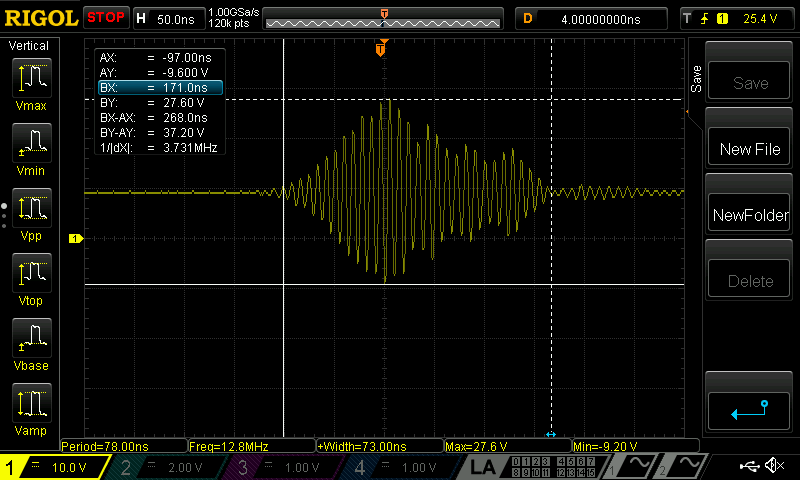 What’s this unit put across the gate-source pins? I set my lab supply to 40V/5A, and did some testing. The highest I caught before I gave up was 27.6V. Yeah, that’s 38% over the absolute maximum. Let’s take a look at the spike! For whatever reasons, the when running the MOSFET “wide open,” there are regular voltage spikes in the form of a bit of very high frequency ringing. The amplitude of the ringing is around 37V, with the peak positive voltage being the 27.6V previously noted. On a part with an absolute maximum rating of 20V. So, that’s why it dies!