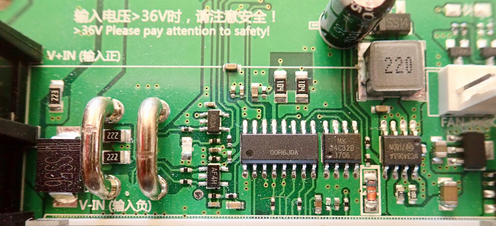 Digging further into the digital section, we’ve got a diode on the far left, the shunt resistor (the fat wires) to measure current, various control circuitry, and the fan jack on the far right. What are the various ICs on the board?