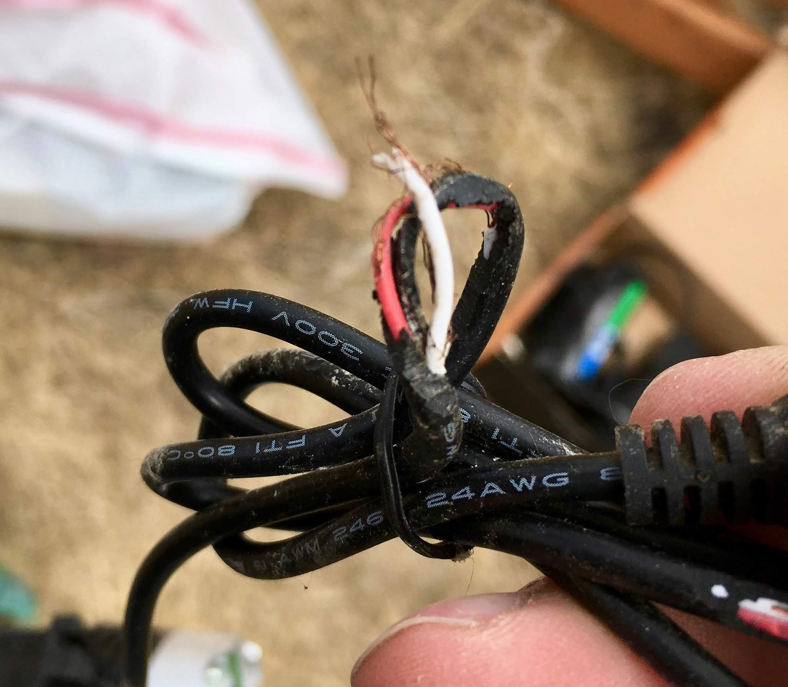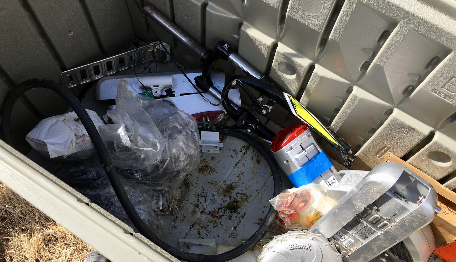 The only real damage I found was a bit of bike light wiring that had been torn apart. It’s easy to fix, and it’s not that big a deal, but it’s definitely not going to work as-is right now (it’d probably short out the battery, which isn’t any fun with lithium - on the plus side, 24AWG is a fuse at some fairly low current level).