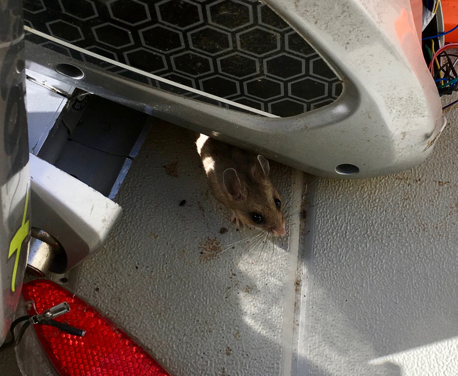 I finally had time a few weekends ago to empty the box out, and figure out how they were getting in (I chased two or three out, and I think there were more in there at some point). I’d noticed the box had racked back slightly, but what I hadn’t noticed was that the tilt meant that there was a gap under the side panel. A mouse sized gap, because those little critters can get through anything their head fits through. I’d stacked ebike wheels against the rear of the deck box, and that was enough, over time, to separate things such that mice could get in.