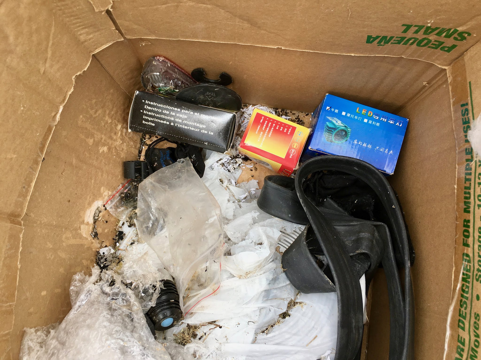 The main problem is that they shred anything paper or plastic to nest. And then crap. This is a box of old ebike parts (and stuff I had laying around to evalute) that’s gotten torn up. There wasn’t much damage, but I had to shake everything out and toss a lot of bags/boxes that were half gnawed.