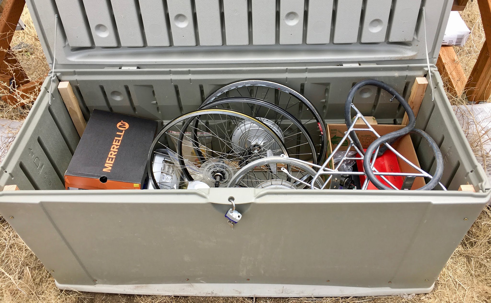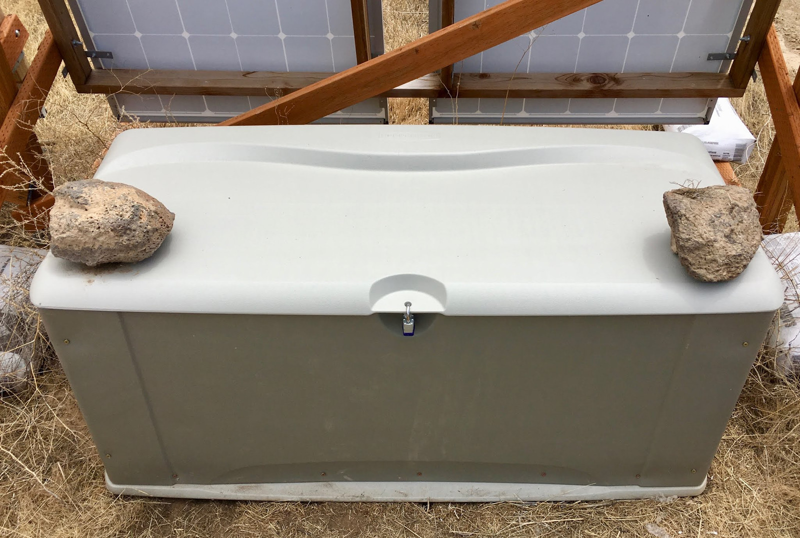 So, logically, when I needed more storage out by my office, I added another deck box under my solar panels. Toss stuff in there, access it when needed, and it was working fine for storing random ebike R&D parts, generator tools, network cables, Nerf weaponry, and the like. You can see it in the lower right corner, behind a set of panels. Yes, the two banks are aimed rather differently. No, it doesn’t make as big a difference as you might think.