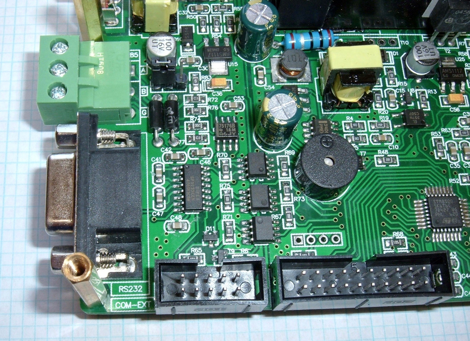 Zooming in, the lower left corner of the board is most exciting indeed! This is the communications corner - and it’s quite complete. I’ve said before that anything interfacing with reality is likely using serial at some level or another, and this unit is no exception. The 10x2 pin connector in the lower right is the display connector. The 5x2 connector to the left is a TTL serial connector (and I’m documenting the protocol next week). But, it keeps going. The lower left connector is an old-school RS232 serial DB9 connector (some of you may have connected mice or modems via these connectors). And above that is a RS-485 connector! This is a differential serial connection that supports multiple devices on a given bus and insanely long transmission lines. I’ve written about it before in the context of the DMX stage lighting protocol, and I’ve also visited a greenhouse facility that had all the industrial control systems in each greenhouse linked together to a central monitoring station with a long RS-485 run. This is a serious serial powerhouse - and I’ll dive into the serial bits later, to avoid disrupting the main board overview too much.