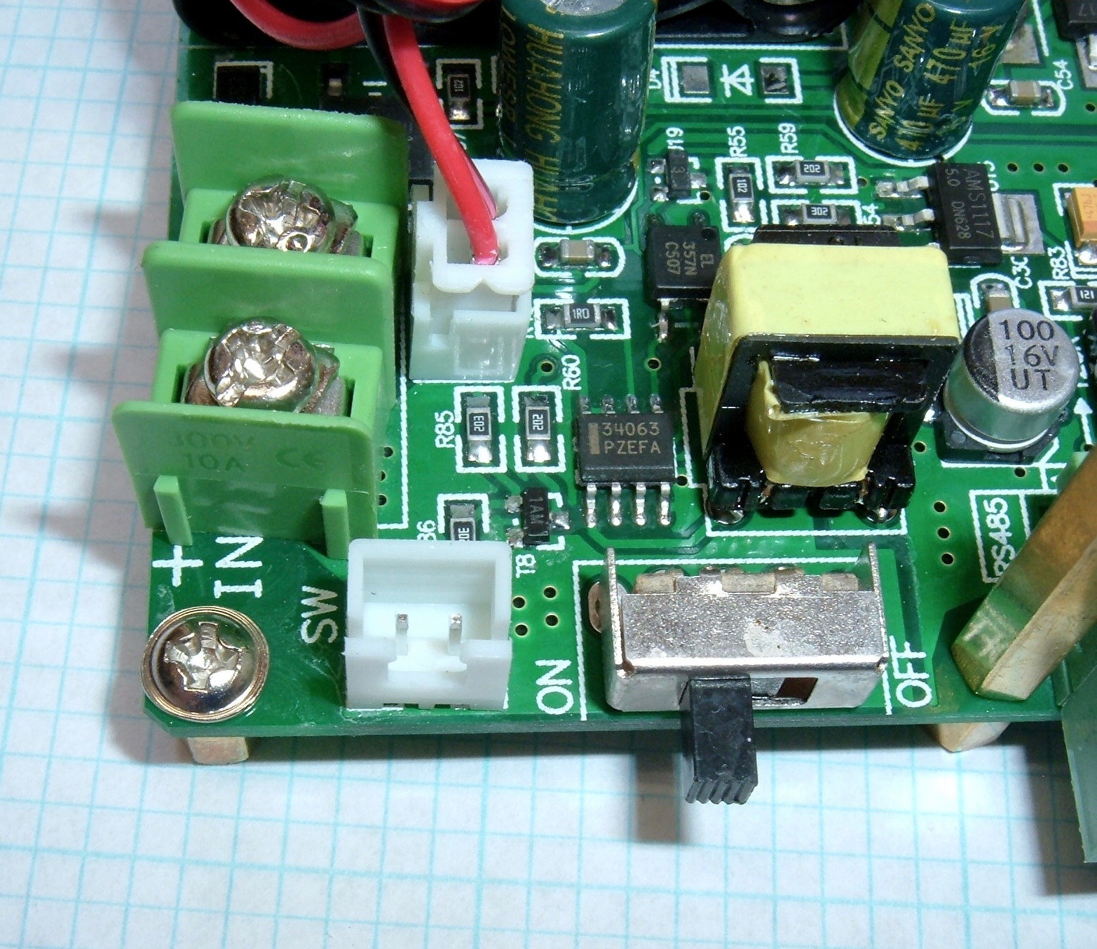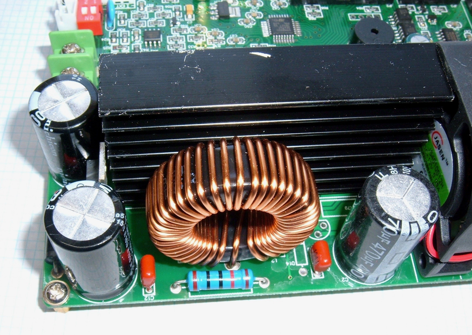 The other side of the heatsink is dominated by the inductor and a few filter capacitors for the input and output sides. Plus a nice resistor. While the capacitors on this unit are in good shape, I’ve started to notice a tiny bit of crud on the capacitors on my lighting power unit, which has been in service for about a year. You may have to replace the capacitors on this unit at some point, which is annoying, but not really that big a problem (and only with very heavy use).