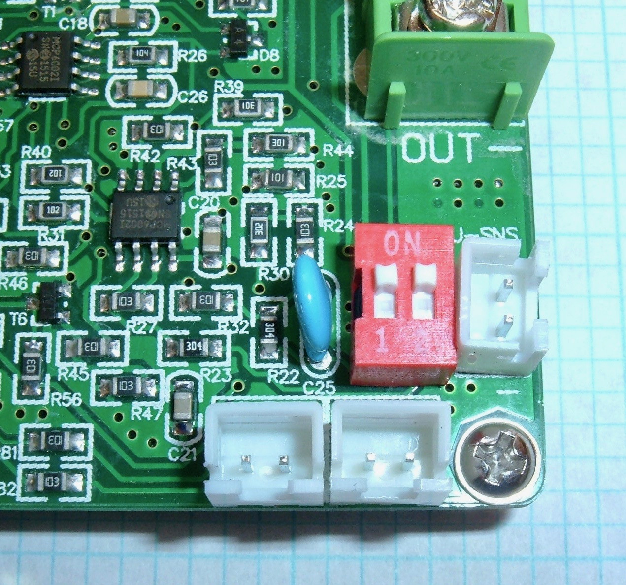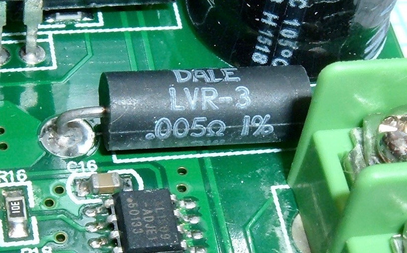 Finally, right by the output terminals, there’s a 1% tolerance 0.005Ω resistor - a current sense shunt. For those unfamiliar with how you measure current, it’s rare to measure current directly (you can do it with the magnetic clamp on meters or hall effect sensors, but they only work well at higher currents). In a device like this, current is measured with a shunt resistor. The resistor does the whole resistor thing, and creates a voltage drop over the resistor based on the current, subject to Ohm’s Law - V=IR. For this resistor, a current of 1A would lead to a voltage drop over the resistor of 0.005V (5mV), and the full 15A output would be a drop of 75mV.