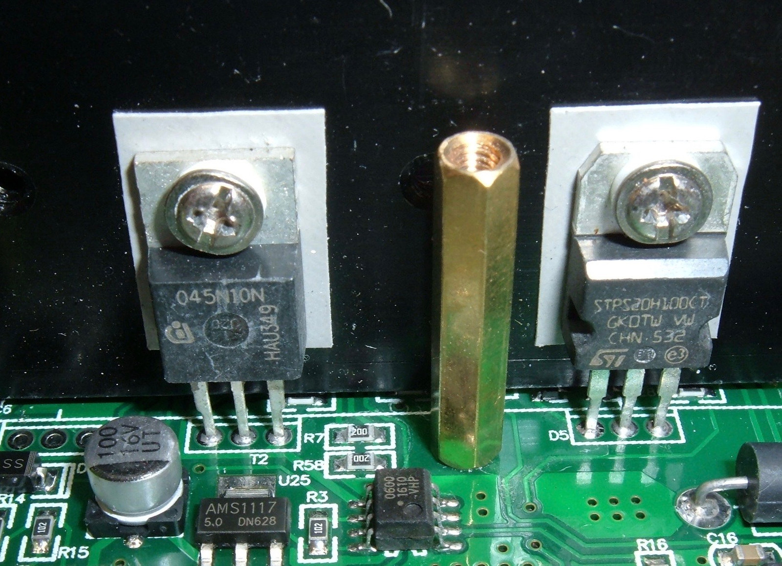 The heatsink contains the switching gear for the power conversion circuitry. On the left, a 045N10N 100V MOSFET (for an 80V rated unit - that’s very reasonable to me). On the right, a STPS20H100C 100V Schottky rectifier. What the heck is a Schottky rectifier? They’re a very fast (~100ps response time), very low forward voltage drop diode that’s commonly used in switch mode power supplies (which this is).