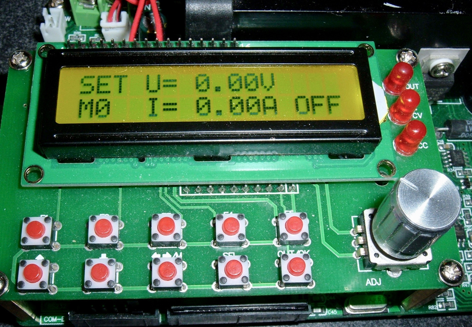 When the unit powers on, you’ll see the basic “set the limits” screen. If you’ve got factory defaults (you should), the unit will power on with M0 loaded (0V/0A), indicating “OFF” in the lower right corner, with no LEDs lit.