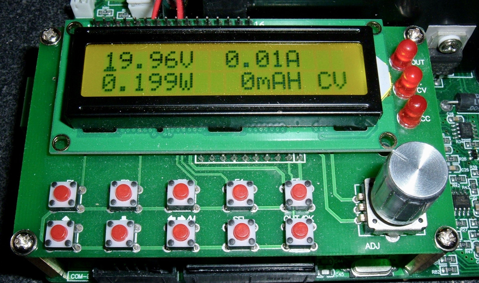 To turn the output on, hit the “OUT/OK” button - bottom right. The screen will then change to the “running” display. This display shows you the current voltage, current current, current watts, total mAh out, and CC or CV to indicate if it’s in “constant current” mode or “constant voltage” mode. The OUT LED on the right side will light up, and the CC/CV LED will light as well (sort of visible here - trust me that the top two are lit up).