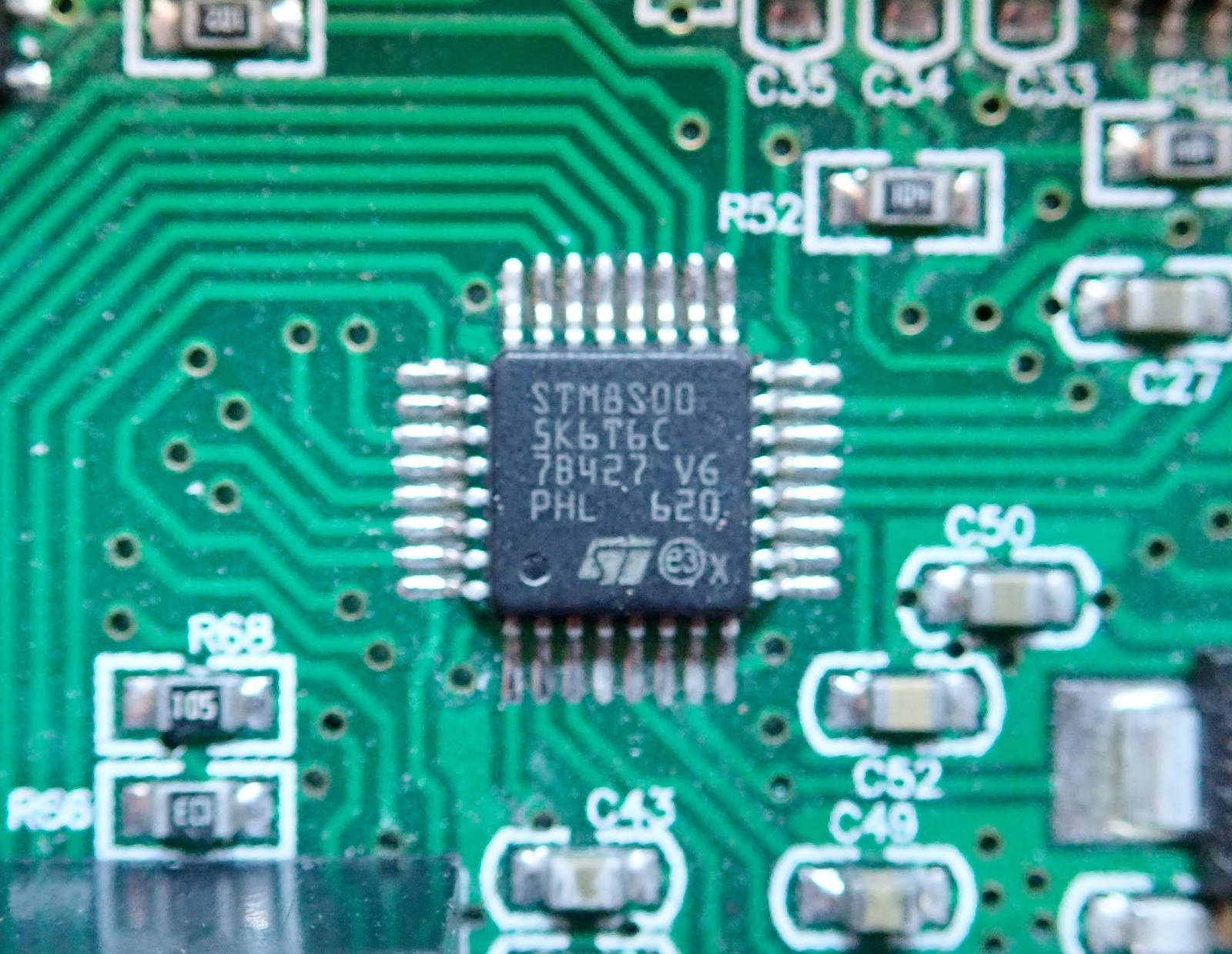 Roughly center in the board, on the bottom, the four sided IC is the main processor for the unit. This is a STM8S005K6 - a little 16MHz microcontroller with 32kb of program storage, 2kb of RAM, and (importantly for a device like this) 7x 10-bit A/D (analog to digital) converters. The A/D converters are voltmeters, allowing for precise reading of voltage and current through the device. It’s comparable in many ways to the Atmega 328s used in the Arduino Unos.
