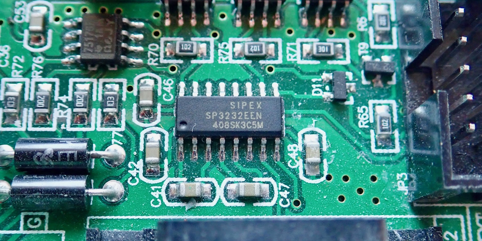 The RS-232 interface is driven by a SP3232EEN chip - a handy little TTL to RS-232 converter chip. It builds the proper voltages internally, as the RS232 serial protocol uses positive and negative voltages to signal. While TTL would use 0V and 5V, RS-232 uses +/- 3V-15V, so you need to drive a negative voltage (as 0V is neither asserted or deasserted, and is meaningless). This handy little chip does what you need for that - and it also inverts the signal, as RS-232 is “backwards” compared to TTL. For TTL signaling, a logical 1 is high (+5V here) and a logical 0 is 0V. For RS-232, a logical 1 is indicated by negative voltage, with a logical 0 being positive voltage.