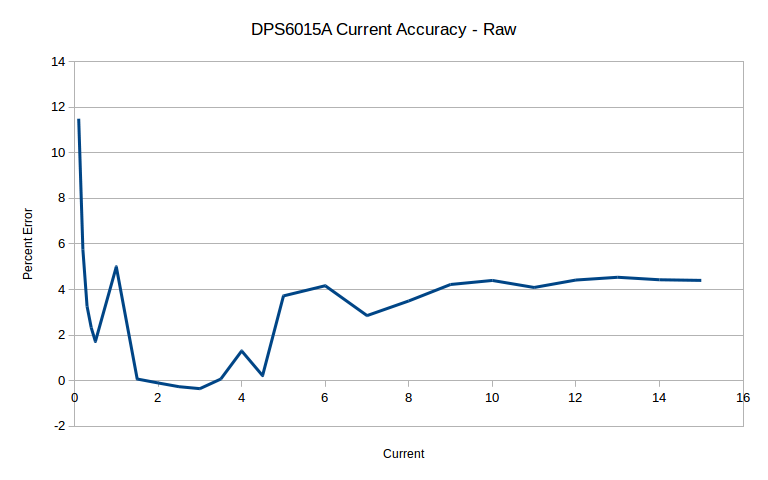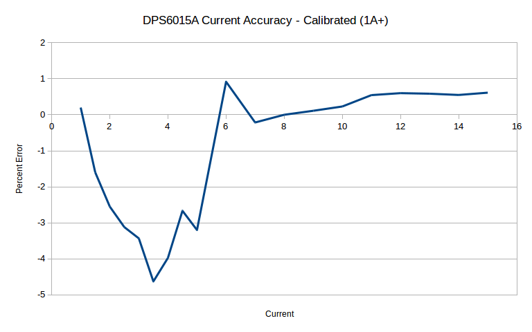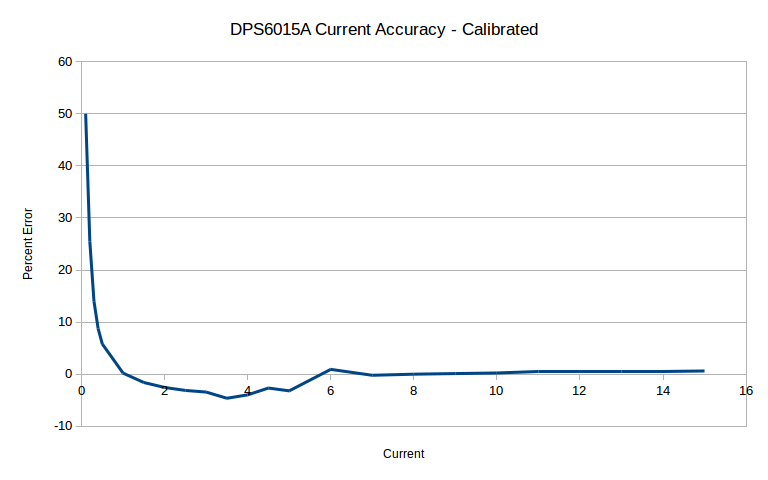 To get something more useful, I zoomed in the graph on the current above 1A. From 1A to 15A, the current accuracy after calibration is much, much better. It’s within -5%/+1%, which still isn’t within spec, but it’s better. In general (or, at least, for my use cases), the current limit is going to be to avoid destroying a device, or to regulate the current through some sort of load that will draw a lot of current, and if one is to err, erring on the safe side is better. So, as long as you’re not relying on the absolute bottom end, current accuracy is decent enough. Still not within spec. Sorry, MingHe.