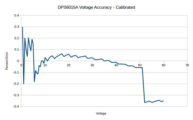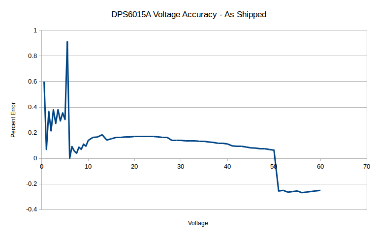 I first ran through the voltage calibration as-shipped, and calculated out the percent error. Out of the box, the unit kept within +1%/-0.25%, though the sudden shift at 50V is where my meter switched ranges and there was a 0.15V shift responsible for that error - that’s my meter, and I need to send it in for calibration at some point soon (the 500V range is off by a hair, and my local calibration shop can’t actually calibrate this unit).