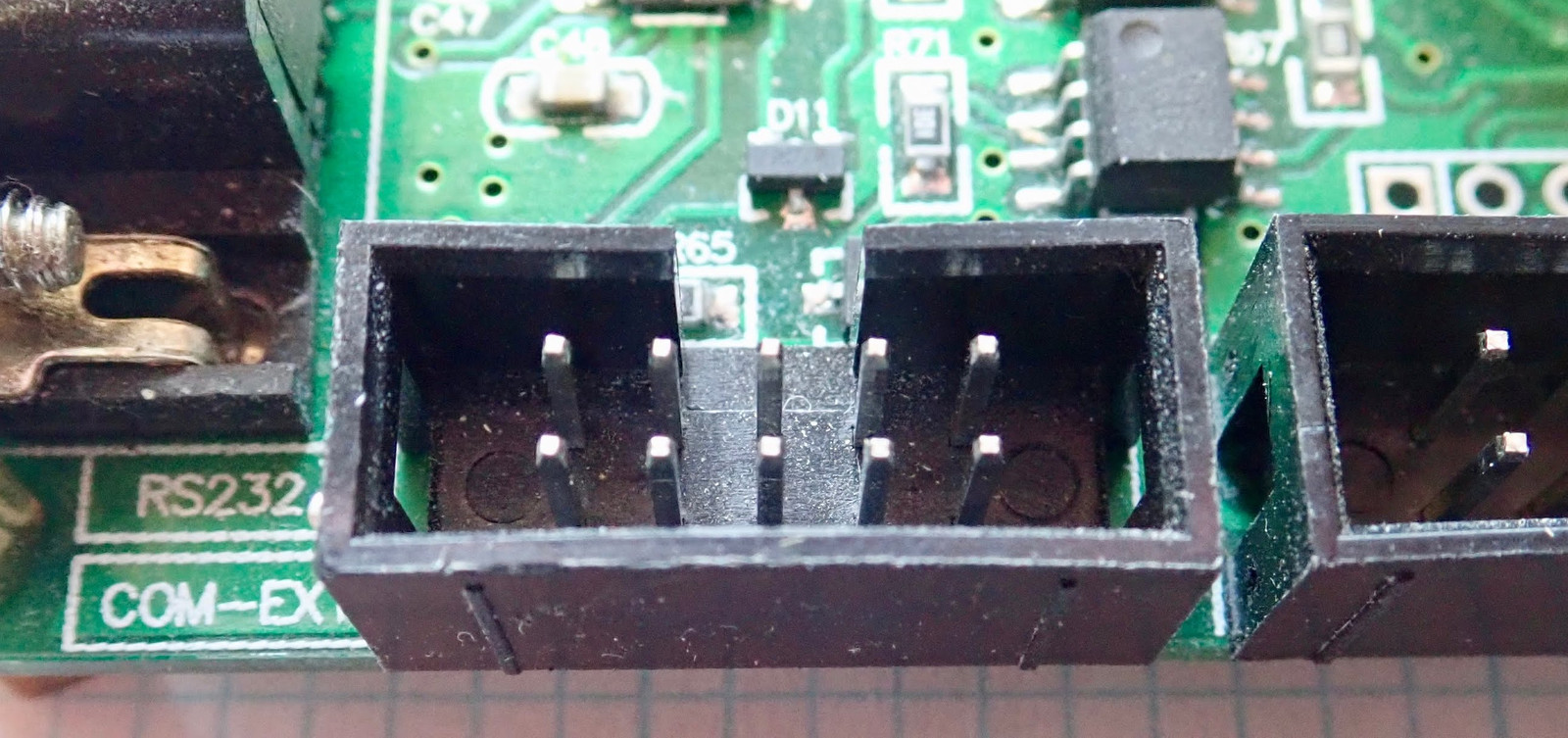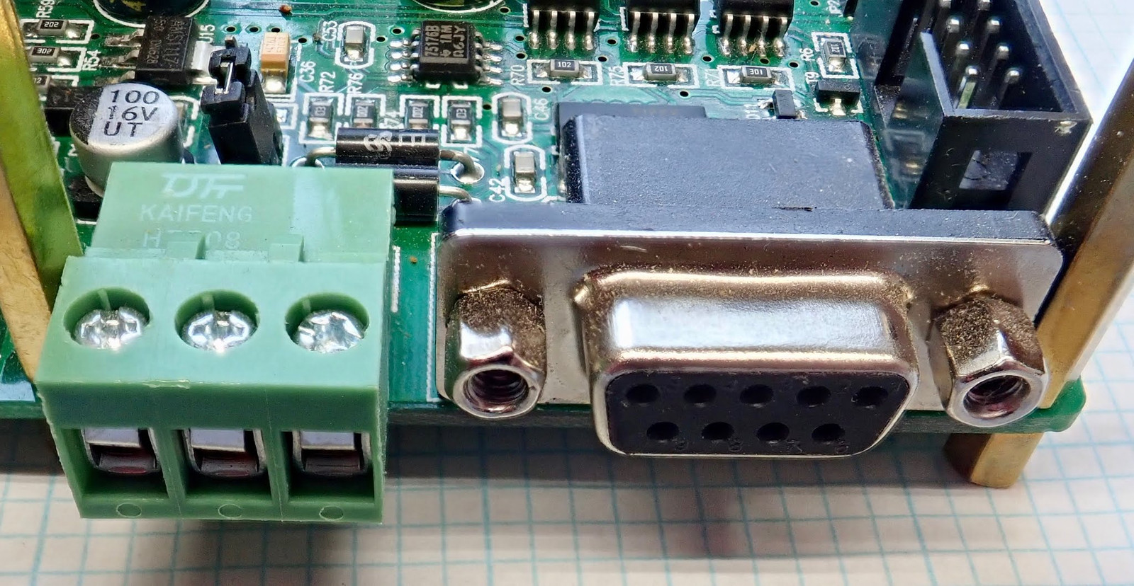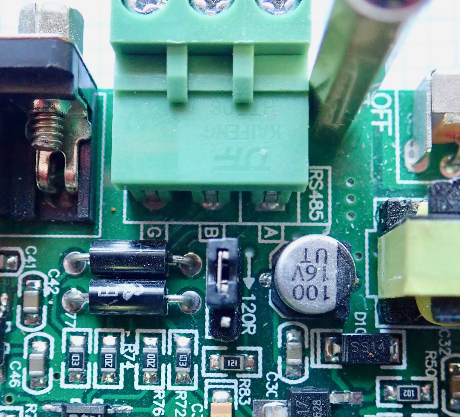 RS485 is the fanciest of the serial protocols supported - it has two signal wires and (normally) a ground reference wire, and it uses differential signaling (one line goes high, one line goes low to signal one value, and the inverse signals the other value). This helps make signals more robust against interference (common mode interference cancels out when the two signals are subtracted). RS485 is also designed for handling multiple stations on a serial link - it’s a point to multipoint link, which explains why these buck converters support different addresses. With RS485, you can have many of these run off a single link, and the units simply ignore commands that are not for them. The connection is to the left of the DB9 port for the RS232 serial, and there’s a jumper that allows you to enable or disable 120Ω termination of the bus. You have the standard A/B connectors and the G (ground or common) connection here.