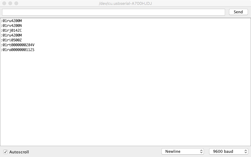 Notice that each command comes back with a full response (colon, address, the full read command, and then the data). It’s handy if you want a bunch of data at once, but it’s not something I support in my interface code. You might want to use this if you’re doing tight data logging, though. It should be noticeably faster than sending each read command individually.