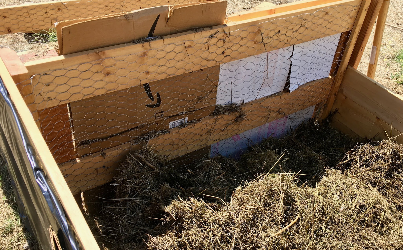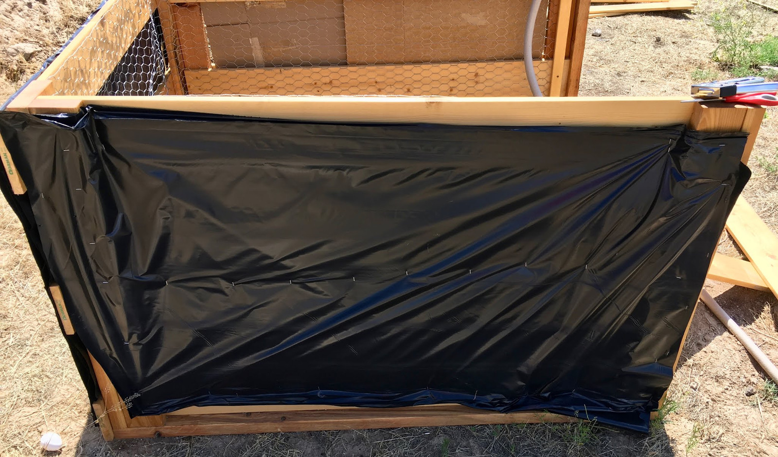 So, with that worked out, I set about trying to fix the problem - cheaply, as I’d rather not build an entire new bin. Enter black plastic and a staple gun! I stapled a few layers of black outdoor plastic around the outside to help keep the moisture in.