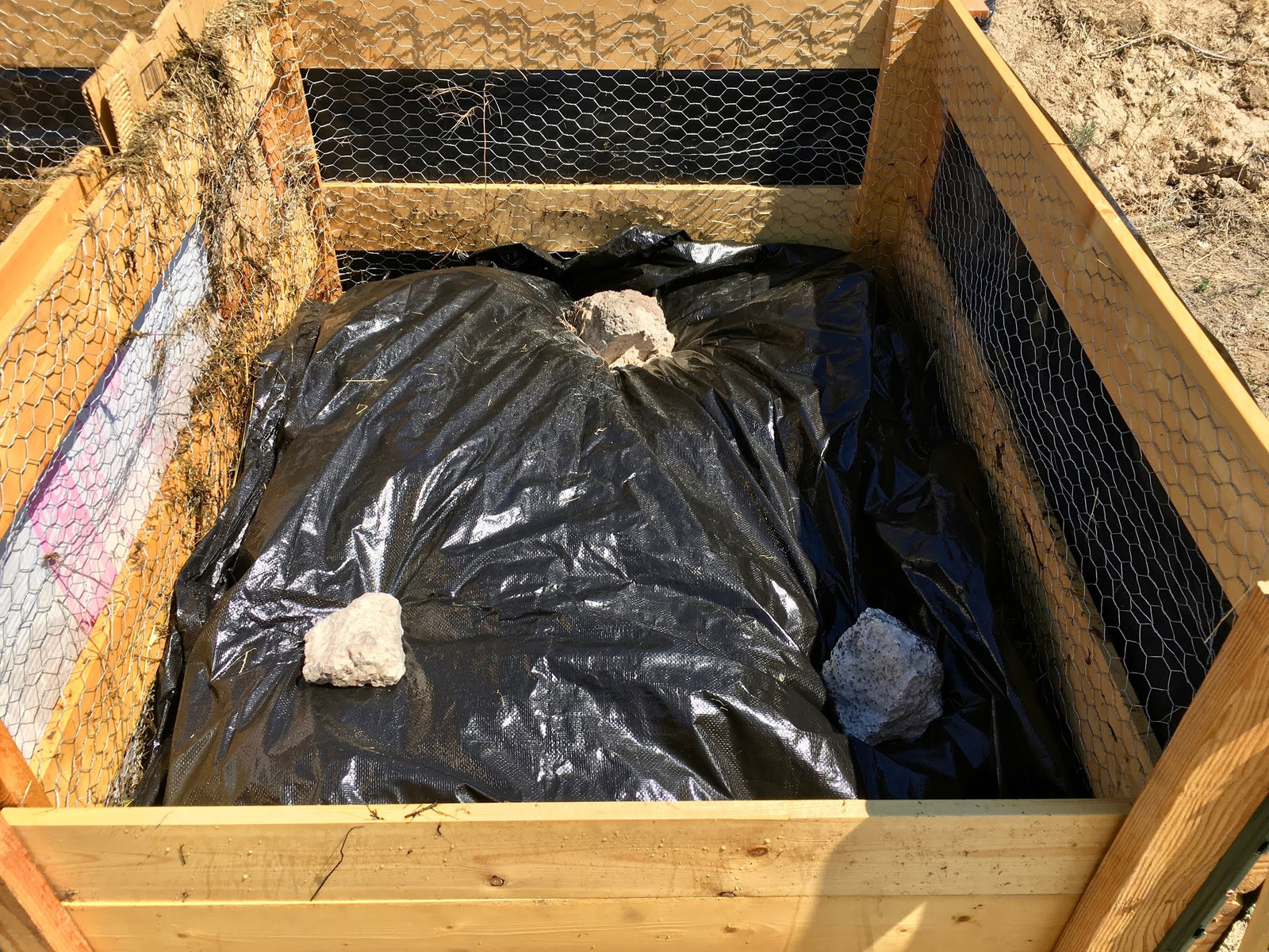 And, finally, to help keep the pile wet, a black tarp over the top of the material, held down by a few rocks.