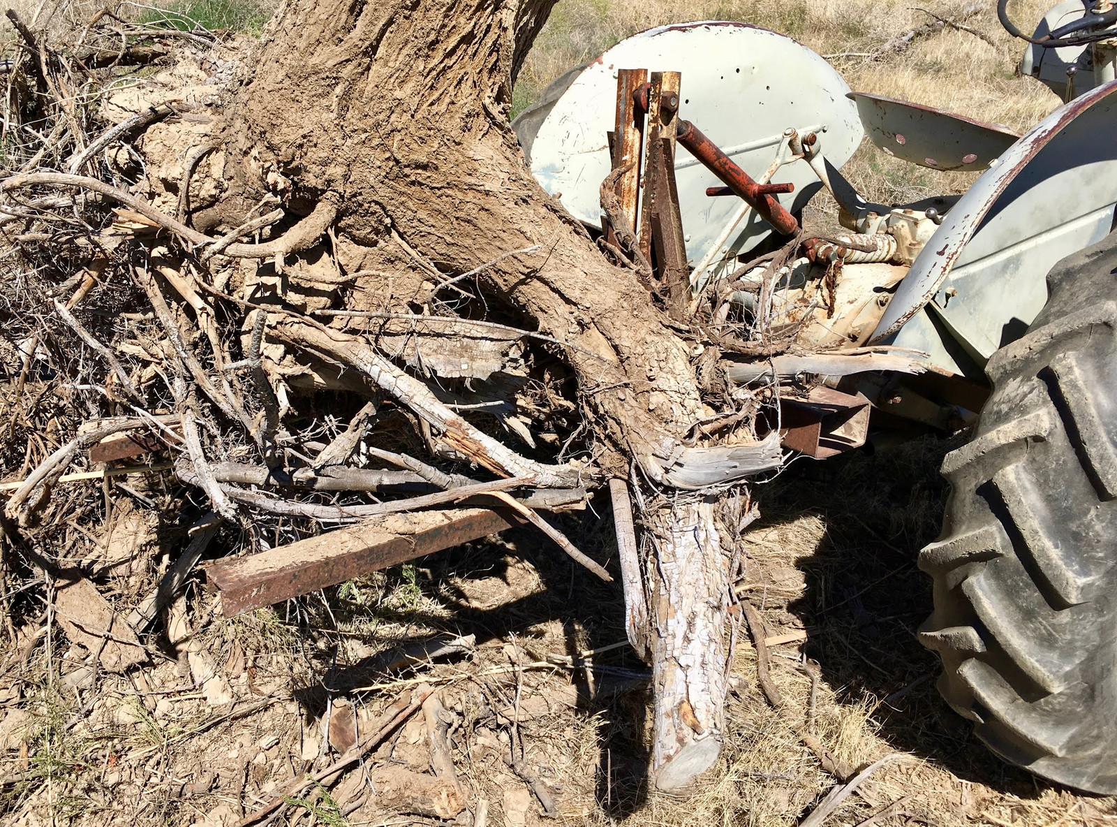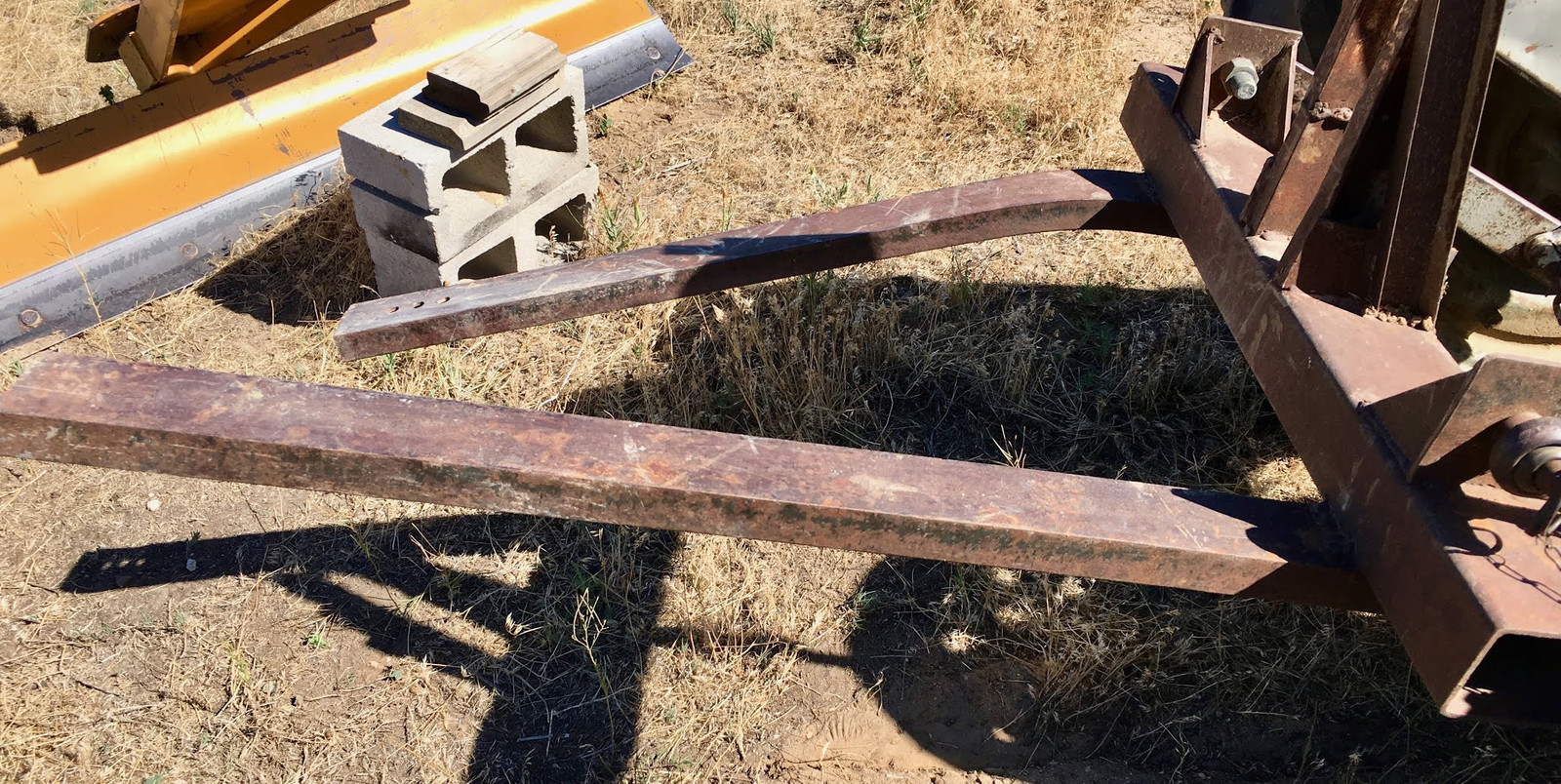 Unfortunately, 75 year old tractor hydraulics are a good bit stronger than the box iron used to build this particular setup. And one stump was either really heavy, mostly stuck in the ground, or both. I did successfully rip it out, but in the process I snapped a ratchet strap and bent up one of the tines pretty badly. Whoops… The tractor was happy to do it, and I had no idea I was bending things while lifting.