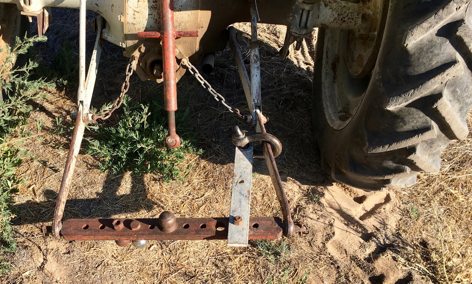 This gizmo attached to the three point harness (well, attached to two of the three points and shackled to the bar for stability) is a drawbar with a bunch of trailer balls in it. The advantage of having it on the three point is that I can lift and lower it easily - and the three point will get low on this tractor. Full on Hermes limbo low!