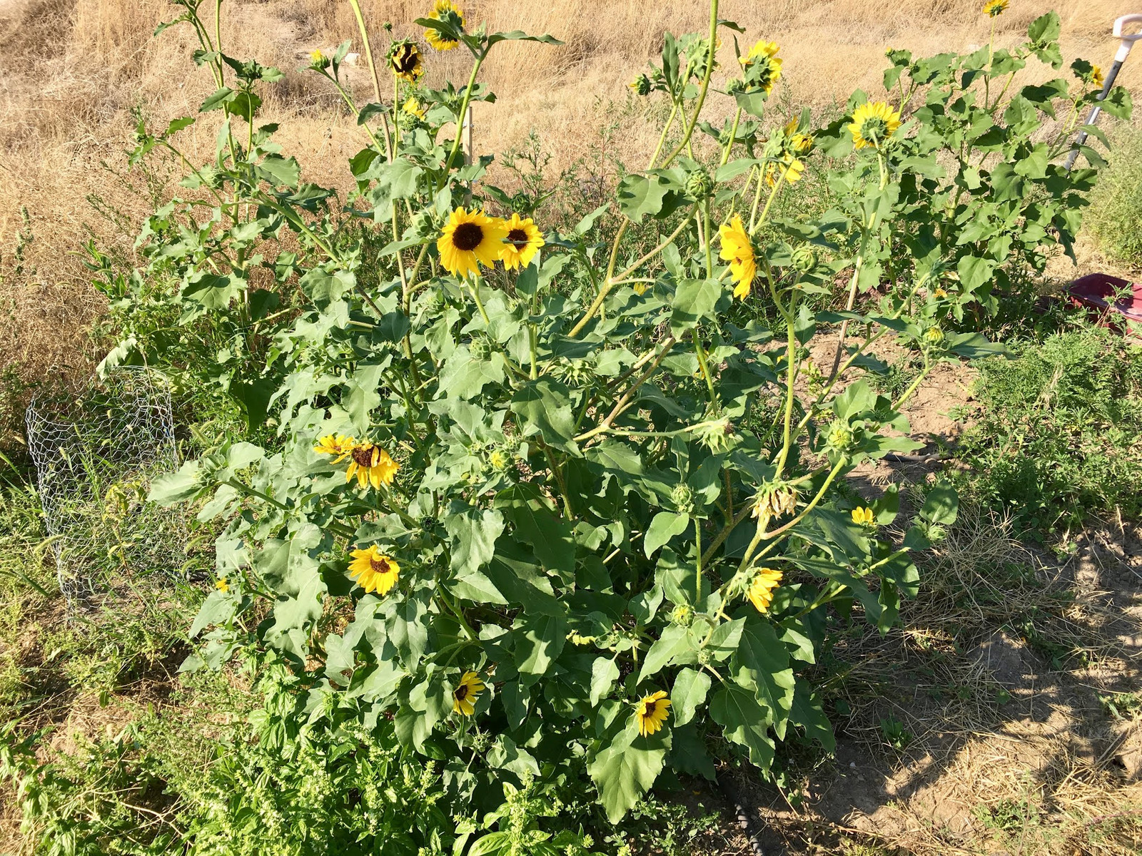 The sunflowers are volunteers on our property. We don’t have a good idea where they came from, we have absolutely no clue where they’ll pop up any year (though I may try to collect some seeds this year), and they’re massive, quite pretty, and we really like them! Even if they are in the middle of our very sad garden.