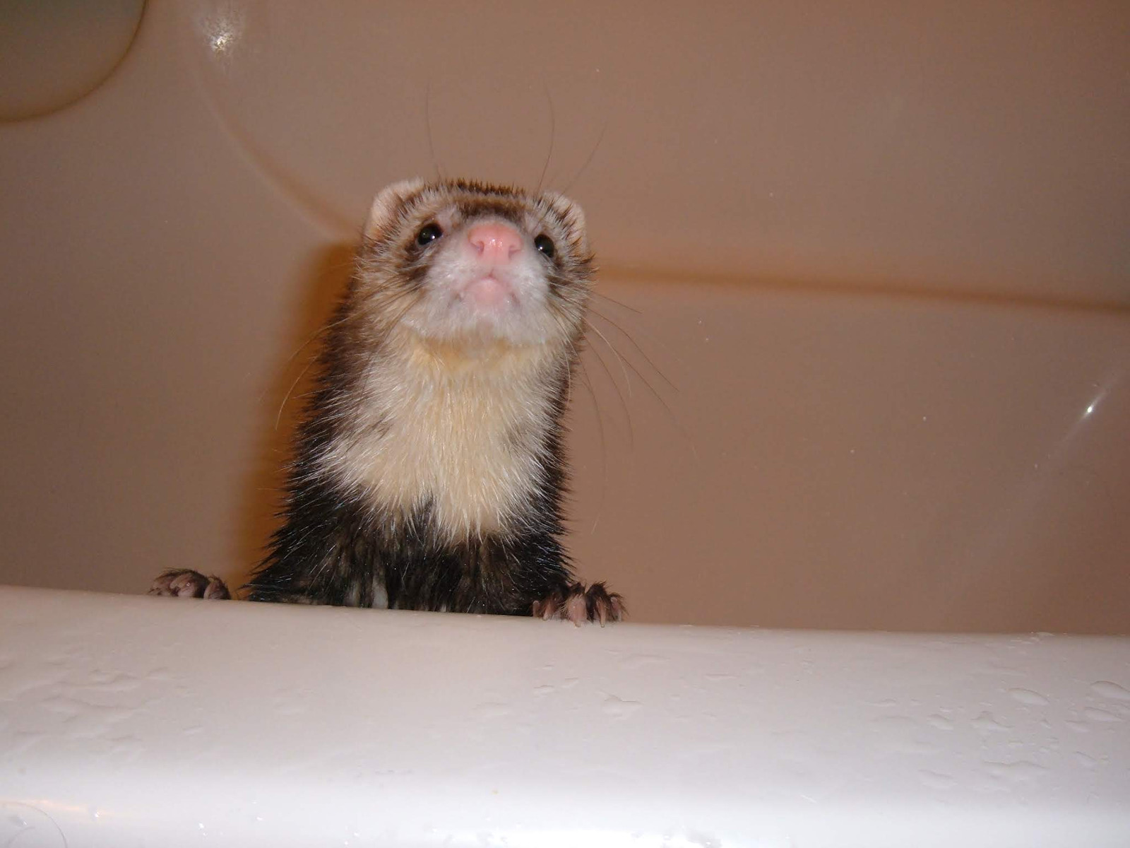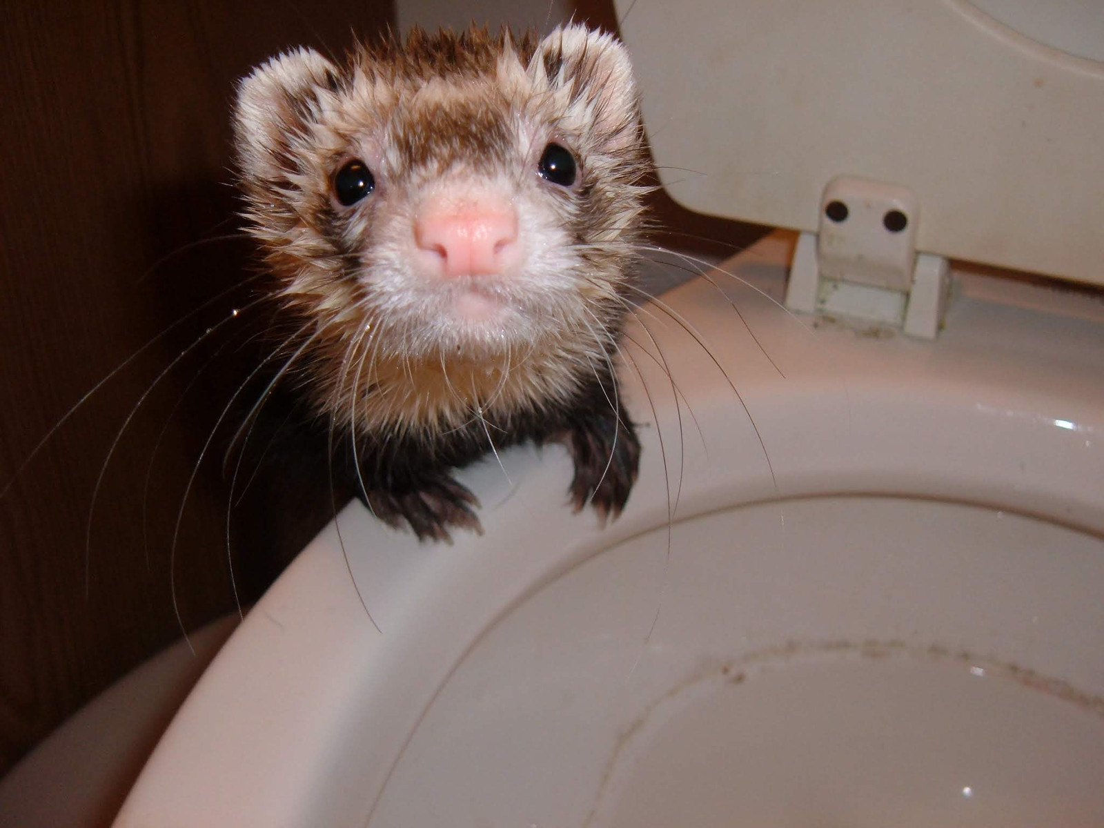 Have you ever experienced the wonder and utter, baffling confusion of having a ferret looking down on you during a shower? This girl figured out how to climb a shower curtain. It was a double layer one - rubber on the inside, fabric on the outside, and she worked out the details of pressing her back against the rubber and using her paws on the fabric to climb the inside of a shower curtain. What did she do once she was up there other than stare at me? Why, climb to the top of the cabinet over the toilet! And then stare at me more, waiting for me to get her down. I folded the shower curtain up after that so she couldn’t climb while I was out, but she continued it - for a while. I can only assume I left the curtain where she could climb it one day, and she discovered that getting down from over the toilet without me around was no fun at all.