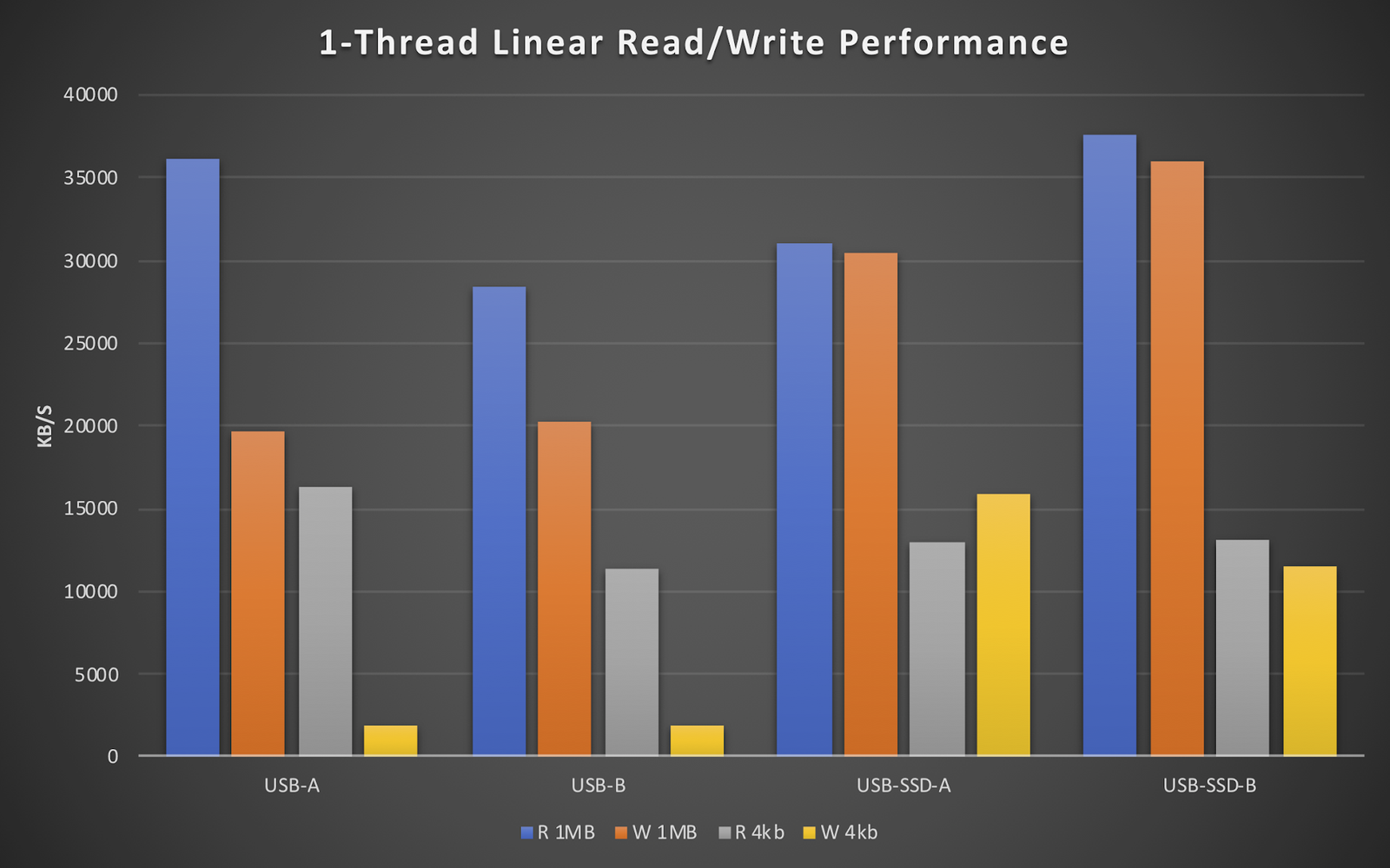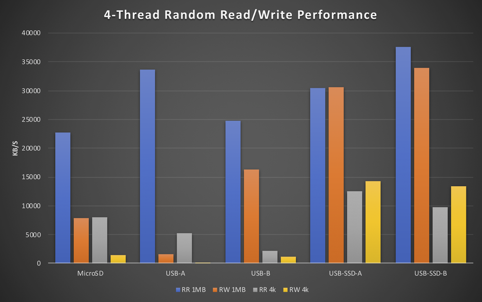 With the large block sizes, reads (blue/#1) are acceptable across the board - including on the MicroSD card. Random writes (orange/#2) suffer badly - on the USB drives and SD card. The proper SSD? This is easy for the, and they’re sitting up near the USB bandwidth. When we go to the 4kb reads (grey/#3) and writes (yellow/#4), the difference is stark. The bulk storage devices on the left just can’t compare with the proper SSDs. One of the USB sticks has truly awful 4k random write - 7kb/s. That’s not useful on anything newer than about an Apple II. Both OS SSDs handle the stream of random writes very, very well. I don’t know for sure, but I’m guessing the limit is how fast the USB2 bus and chipset can send the requests. This is why we need the USB SSDs, though. They behave acceptably for random traffic that reflects real-world behavior.