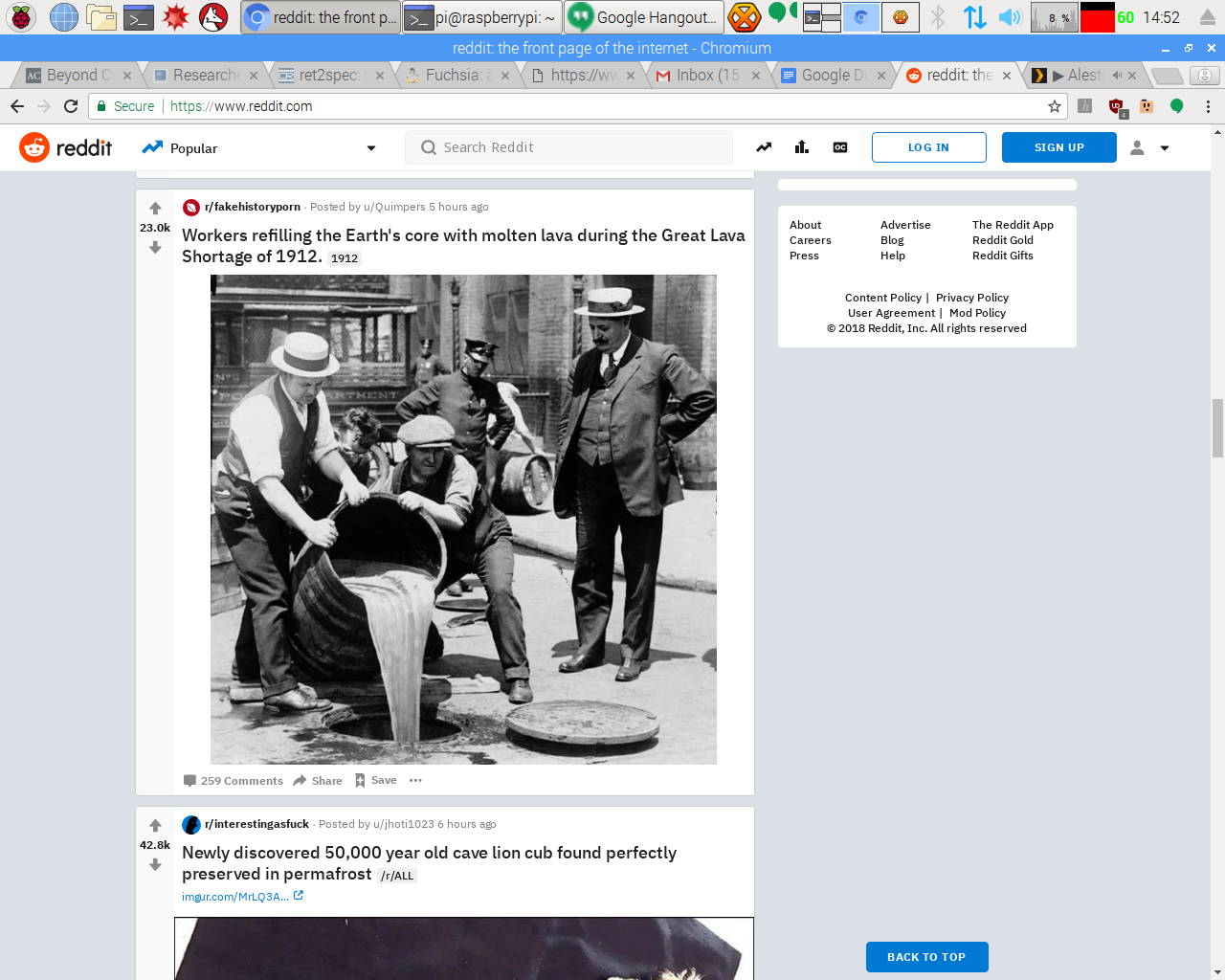 On a different system (I have multiple of these now), I’ve got my normal few terminals open, Hexchat open (connected to half a dozen IRC networks - I still spend lots of time on IRC), and a browser open. Said browser has a few lighter weight tabs open, my full inbox open, Google Docs up, the front page of Reddit (which is quite large) rendered, and for good measure, I’ve got a Plex tab open in the background playing Alestorm. Plus, the Hangouts extension is running. All of this is open, responsive, and all works.