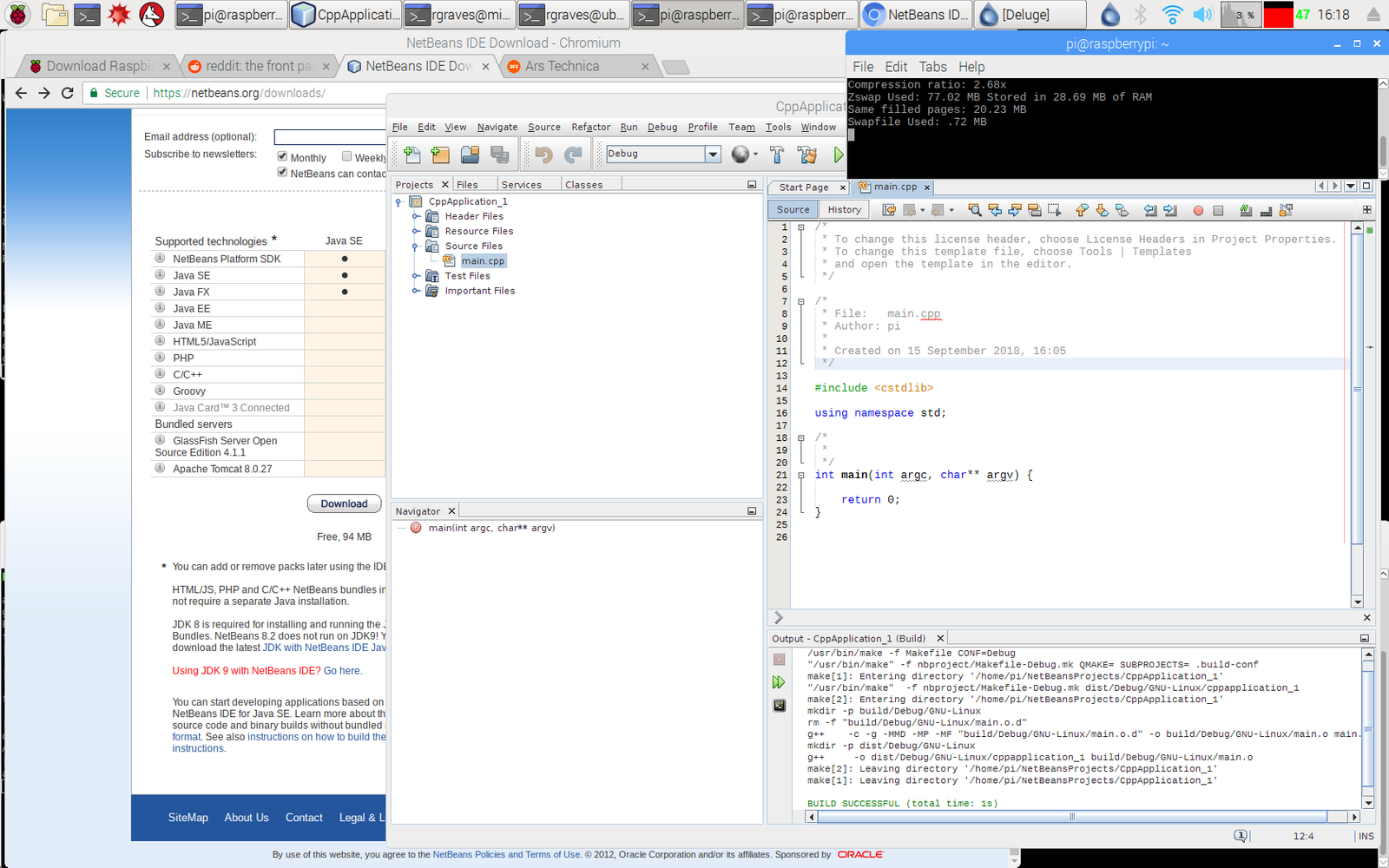 Here, I’ve got a few browser tabs open, Deluge managing a remotely seeded copy of Raspbian, a few terminals, and, to top it all off, Netbeans running and building C code! Yeah! On a Raspberry Pi! It runs just fine - not the fastest thing on the planet, but for simple projects it’ll hold up. I’m not even pushing the memory limits that hard here.