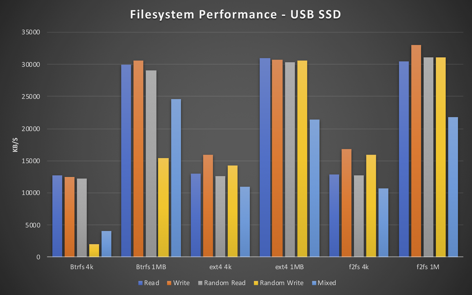 This is all on the same Pi, the same SSD. I’ve tested btrfs, ext4, and f2fs, with both 4kb and 1MB block sizes. All these tests are with 4 threads, as that’s the sort of performance I’m most interested in.