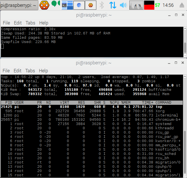 The most commonly used compressed swap system is zram - it’s commonly used on low memory Android devices, and some tutorials for the Raspberry Pi mention it. But zram has limits that make it poorly suited to desktop use on a Raspberry Pi. It can never “spill out,” so if you pair it with other swap, it suffers from “LRU inversion” - least recently used inversion. This means that the earliest stuff swapped out, which is likely to be the least useful, gets stored in the compressed swap (taking up memory forever), while more recent data (which is likely to be more useful) spills to disk.
