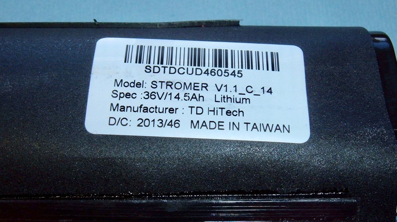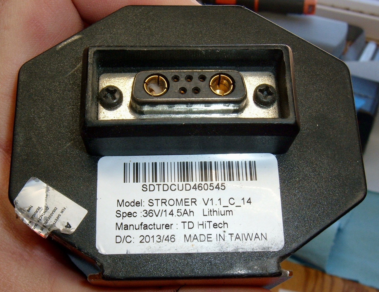 I can say that this is the same connector that BionX uses - a 7W2 connector. The two large end sockets are the positive and negative sockets (one with a bit of a spider web in it), with the middle pins being used for various other things (usually communication or a low voltage supply for a console, lights, etc). The tag mentions that this is a 36V/14.5Ah pack, which works out to 522Wh, exactly. I might be inclined to call it a 37V pack (most lithium cells have an average voltage over a useful range of 3.7V, and this is a 10S pack), so if anything, the rating is conservative. Not having the equipment to properly test the pack in fully assembled form, I’ll take them at their word. For per-cell capacity, 14.5Ah / 5 cells = 2900mAh per cell, which is a common enough size, and very reasonable. I have_ no_ complaints about what they call this pack, which is nice. I’ve been pulling apart tool batteries that are well and truly “creative” with what they call things. Marketing had no input into this pack’s spec tag!
