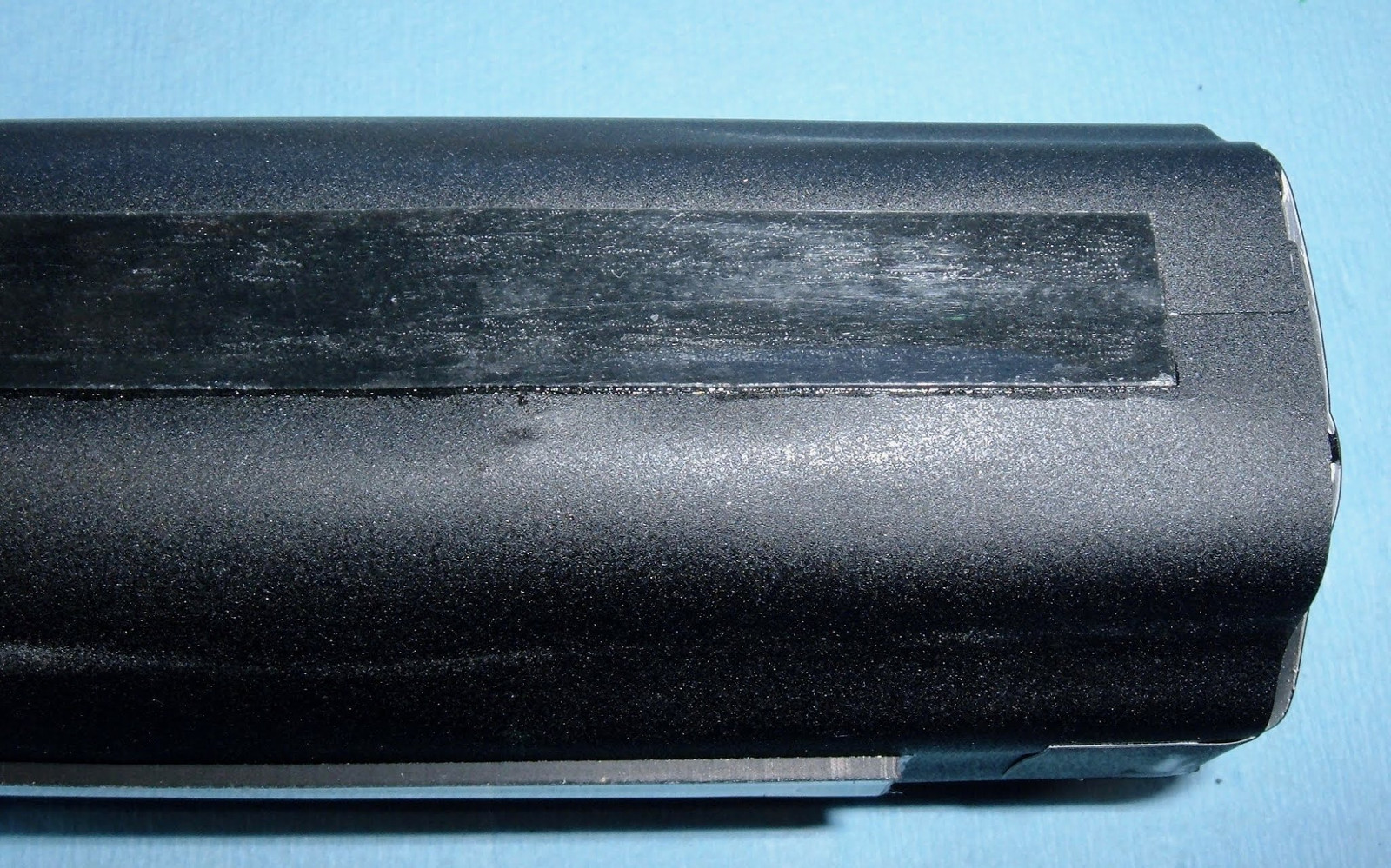 With some of the foam removed from the ends, the whole inside of the pack slides out. It’s in there firmly, but not excessively tightly - the friction getting it out is from the foam at the ends. Again, you can see some foam padding along the sides that helps keep the pack protected from shocks. It’s a long battery!