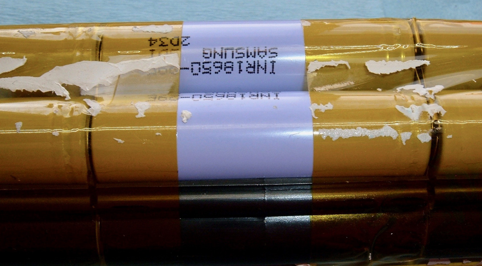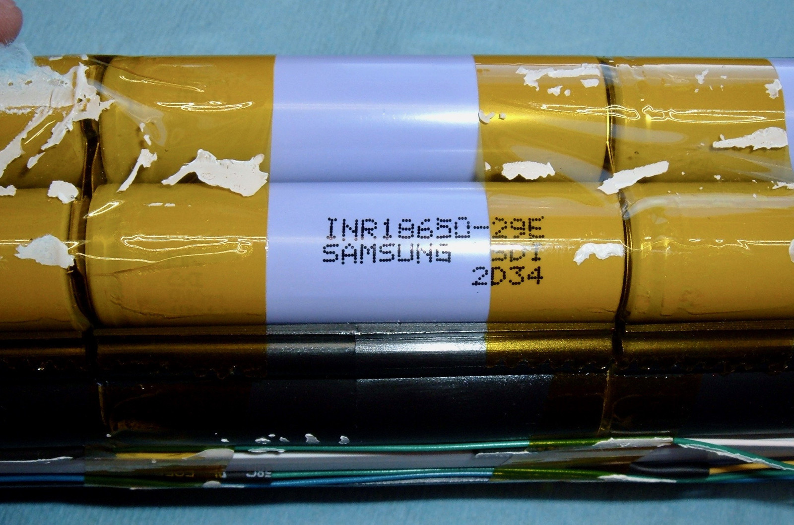 With the wrapper removed, we can see the cells - Samsung INR18650-29Es. A good cell, by a good cell maker. Nothing dramatic here, just a well chosen cell. They’re rated for 2.75A continuous (so 13.5A for the pack, or a hair under 500W), and 8.25A peak (41.25A, or about 1500W). Plenty of current capacity, and while they’re nominally 2850mAh, you can get them up to 2900mAh at low discharge rates.