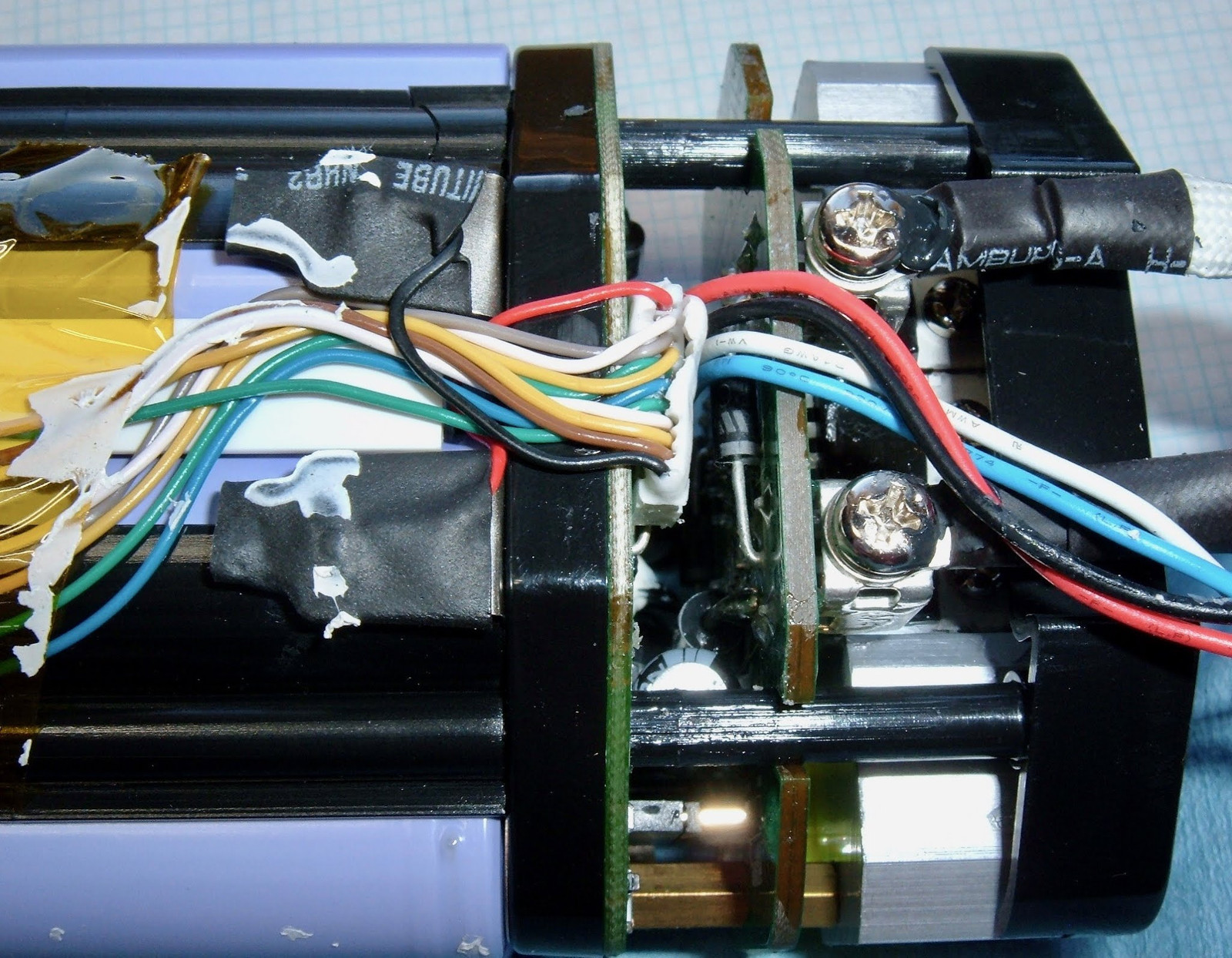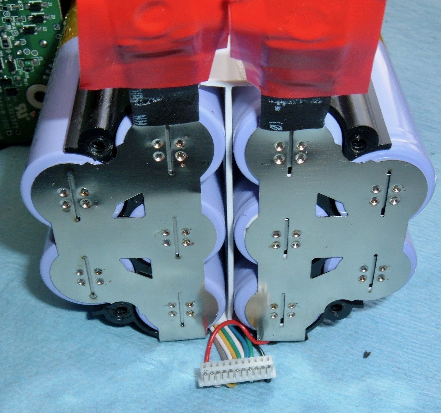 For the cells running down each row, they’re positive to negative, bound together with custom cut nickel strip. You can see how the pack is “folded” on the inside and outside edge here - if you look at the left joint, you see two ends of nickel strip (which, if touching, just helps improve conductivity). On the right joint, you can see the pair of folds on the outside. The pack is built in a “long” configuration, and then is folded into the cases and taped. I’ve not seen something quite like this, but I like it - there’s no way for rubbing through insulation to cause a short circuit, because every folded bit of nickel is at the same voltage across the whole thing.