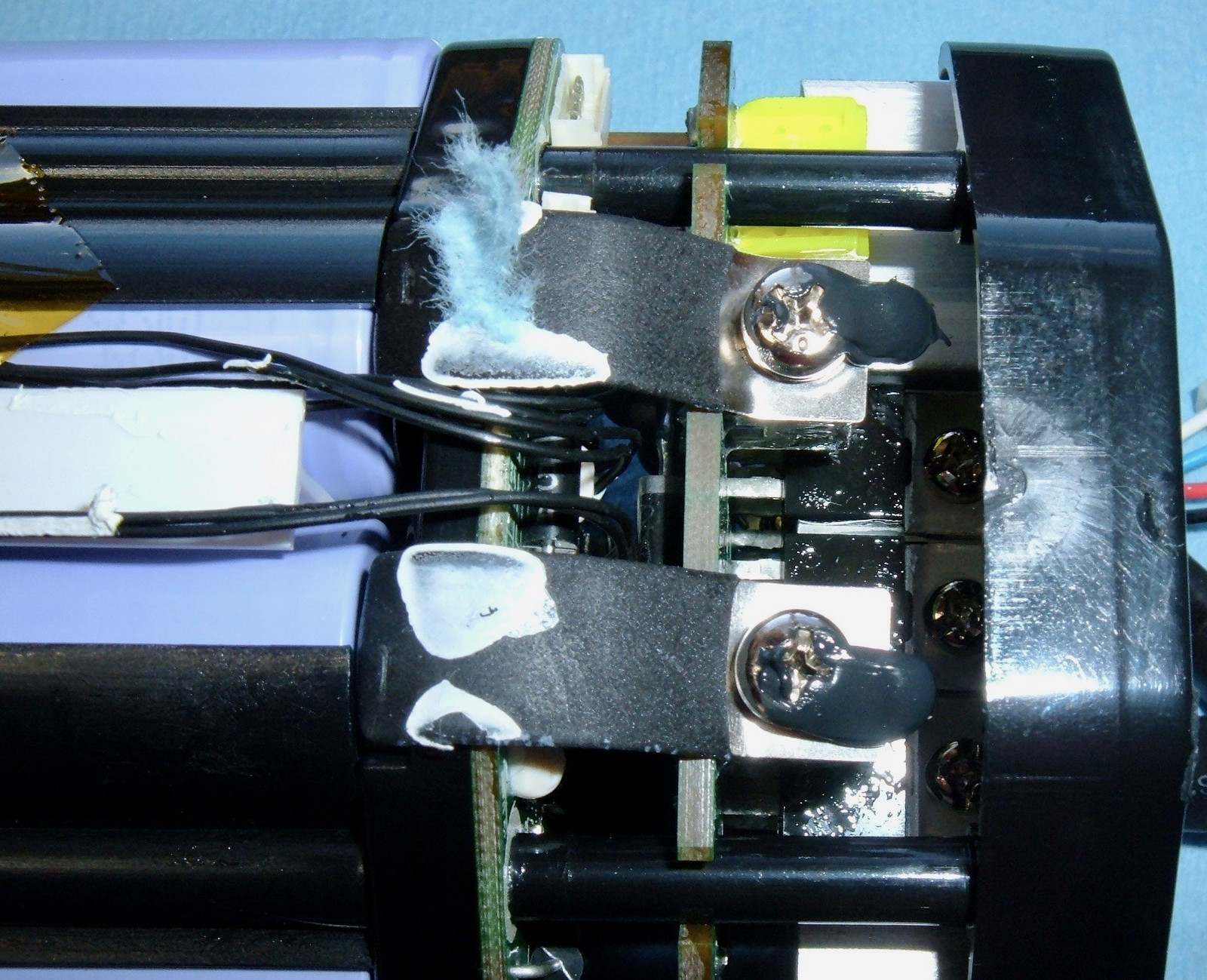 Flipping it over, the other side of the pack contains some paper towel fuzz from my workbench, and the screw connectors that connect the main pack ends to the BMS for output control. You’ll notice that all the high power screw connections are “gooped” with some sort of rubber sealant. This prevents them from backing out in a high vibration environment - say, an electric bike getting ridden on gravel! I really like the screw connections here. I haven’ had to pull out a soldering iron yet, and it looks like I won’t have to unless I want to swap out the balance wires! Everything I’ve seen so far indicates that people who knew what they were doing were left alone to build a really nice, reliable, long-lived pack. It’s not a cheap Chinese Special, but I’ve also not seen anything that seemed purely overkill to me - it’s well thought out for the environment, well assembled… no complaints yet!