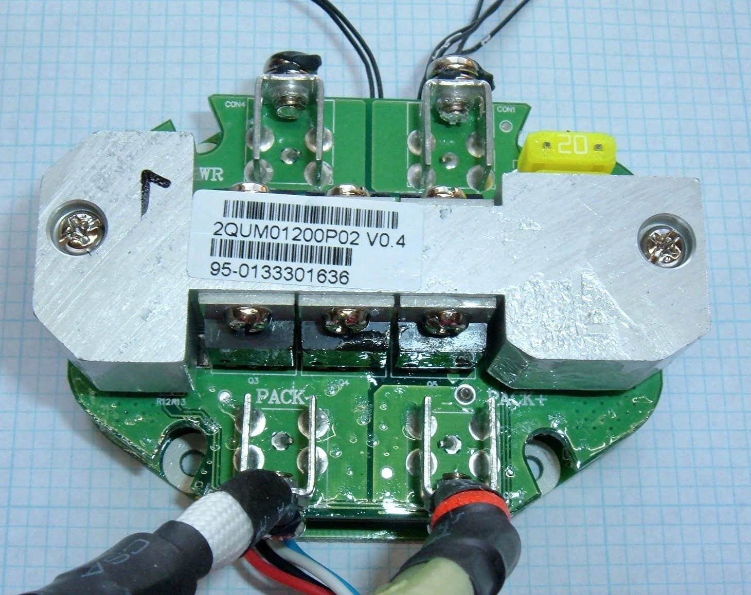 With a little bit of fiddling, and removing a few more temperature sensors, the whole BMS comes free! This is a double layer BMS (first one of those I’ve seen on an electric bike), though the total board area is comparable to other units I’ve seen. The big hunk of metal on top is a heat sink for the switching FETs, and the battery/pack connectors are these massive bits of metal, firmly soldered into very large planes on the circuit board. Beefy! The fuses aren’t replaceable (easily) - they’re soldered in. From a longevity perspective, that’s perfectly reasonable, and it means you won’t have a loose connection at that point in the future.