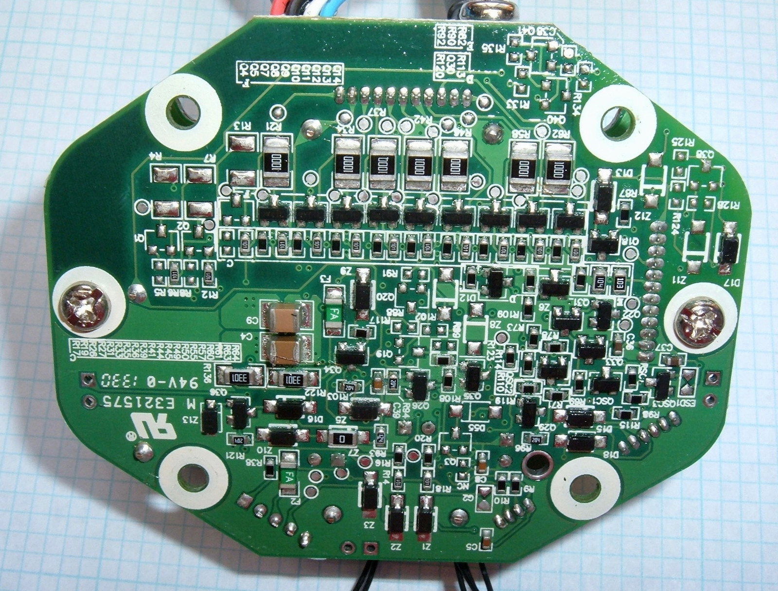 Flipping the board over, you can see a row of transistors and bleed resistors for balancing the pack. There are 10 little transistors to switch the segments on and off, and… 7 resistors. I’m not quite sure how this is wired up, actually, but it seems to work fine for them. There are some extra unpopulated spots that would likely be used for a higher voltage pack, if they ever add one of those. It’s not fully wired for that, but at least some of the routing is done already.