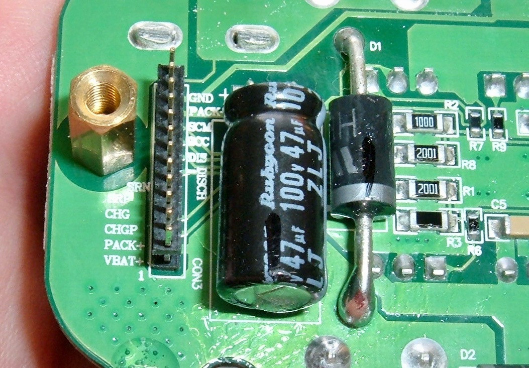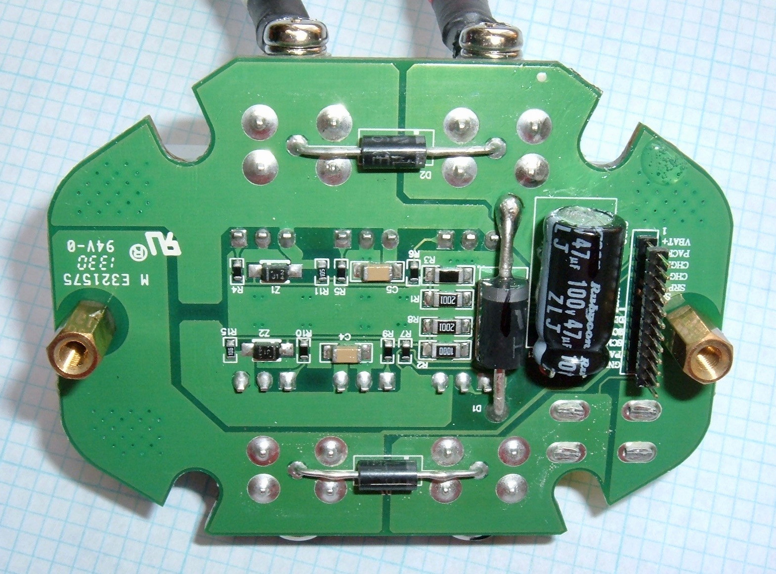 The bottom of the board contains a fairly large filter capacitor, the usual anti-reverse-charging diodes, and some hardware for controlling the switching transistors. On the right, you can see the interface between the two boards - and it’s labeled! Woo!