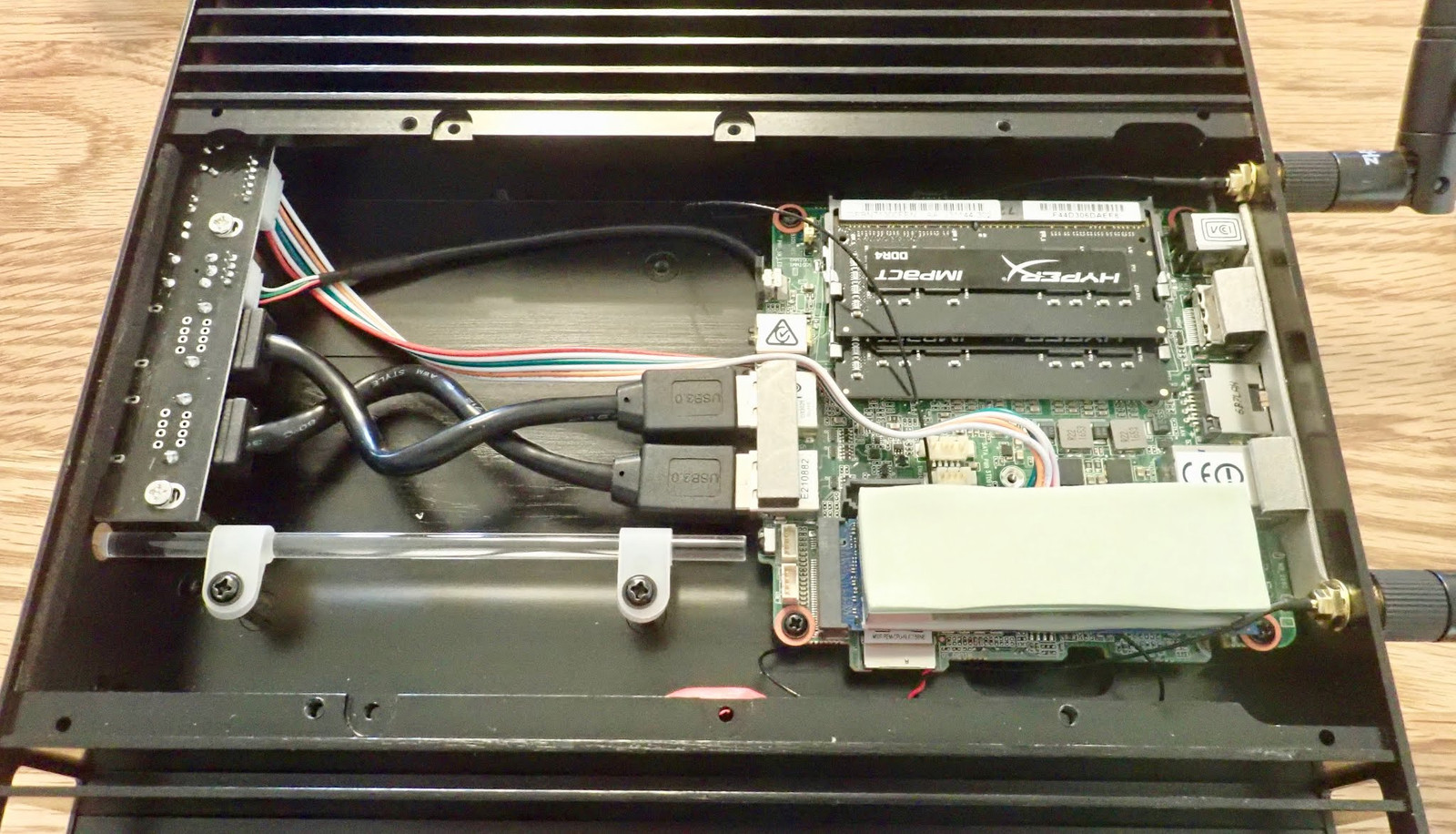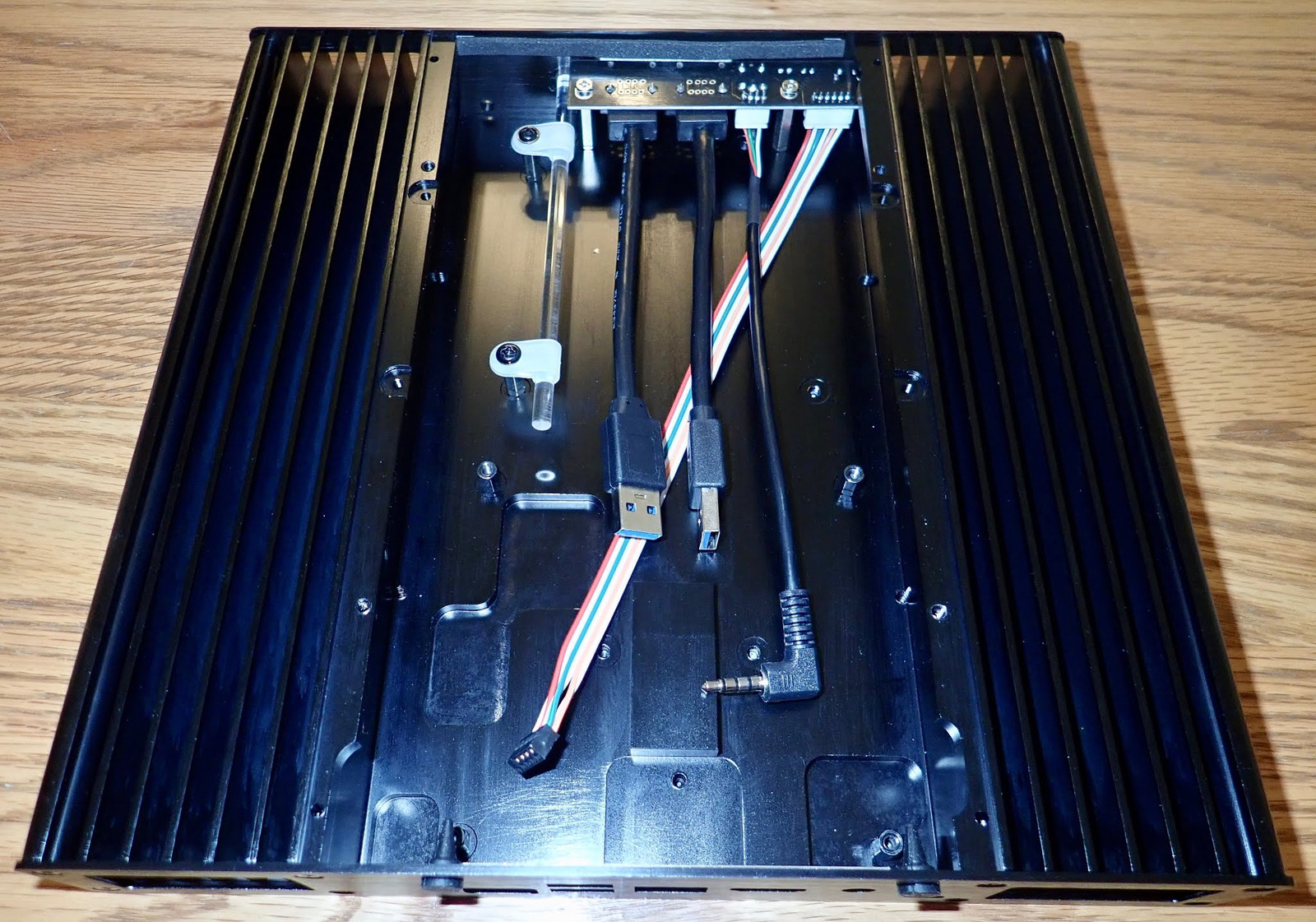 The top plate comes off with four screws, and inside, there are a number of connections to stretch from the edge of the case to the NUC board. You have to transplant the board into the new case - but, conveniently, the NUC form factor is pretty standard, which means that cases like this are fairly easy to design! We’ve got (on the left) an IR guide (so remotes work with the onboard IR sensor), a pair of USB3 connectors, a headphone jack extension, and a power/status cable header (that goes to the standard NUC header).