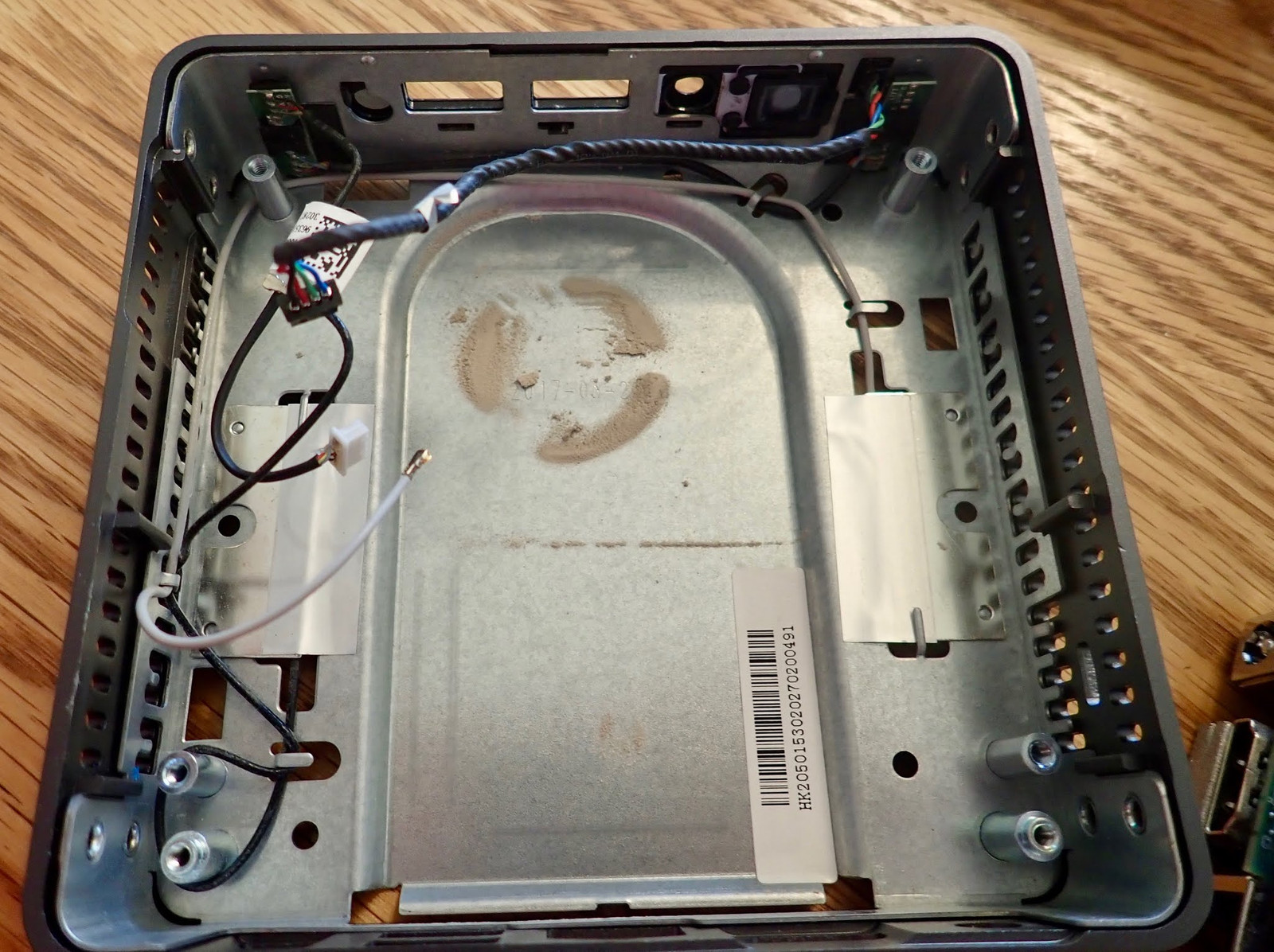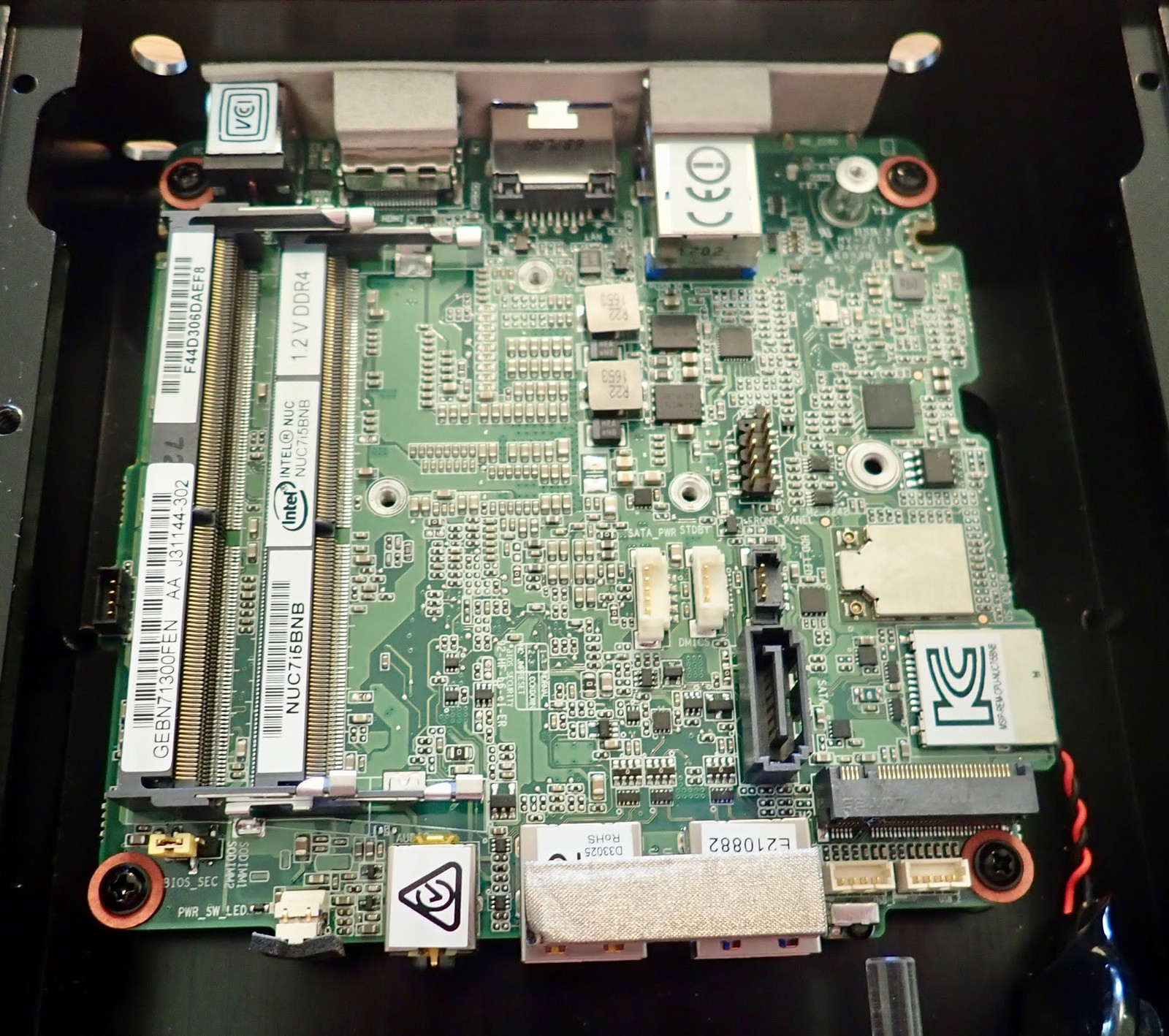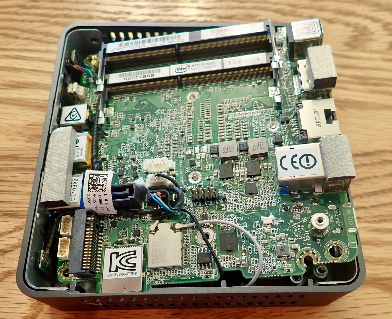 If you’ve not seen the insides of a NUC before, they’re awesome little machines. In any case, if you want to pull the mainboard out, you have to remove various parts to get at the screws. You might not have to pull the RAM, but… I did. Instructions on removing NUC boards are rather missing in action.