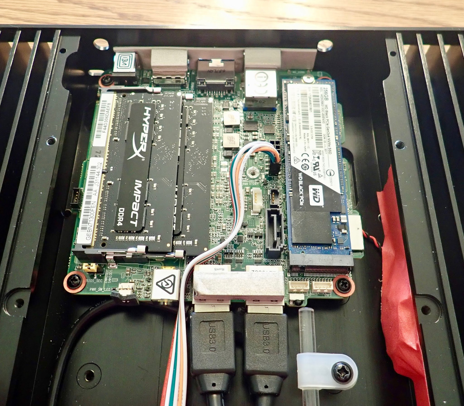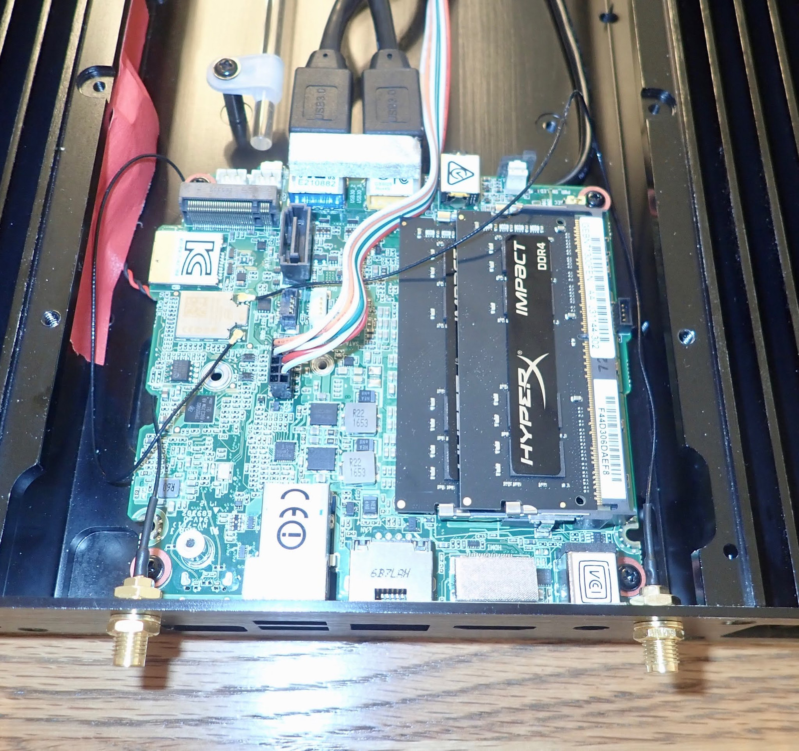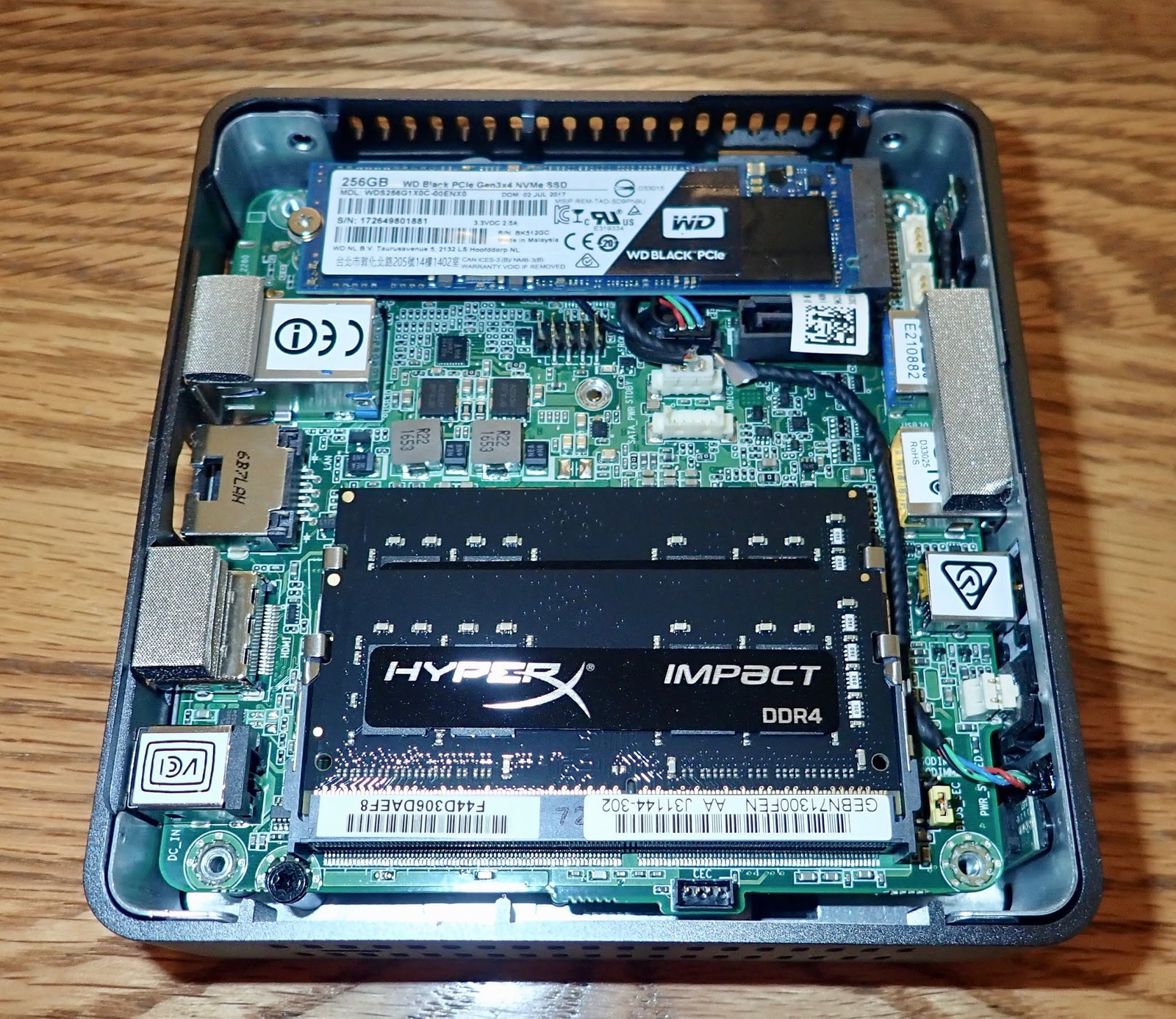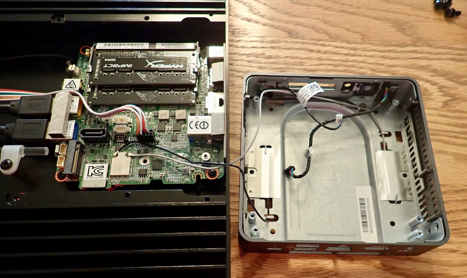 If you’ve not seen the insides of a NUC before, they’re awesome little machines. In any case, if you want to pull the mainboard out, you have to remove various parts to get at the screws. You might not have to pull the RAM, but… I did. Instructions on removing NUC boards are rather missing in action.