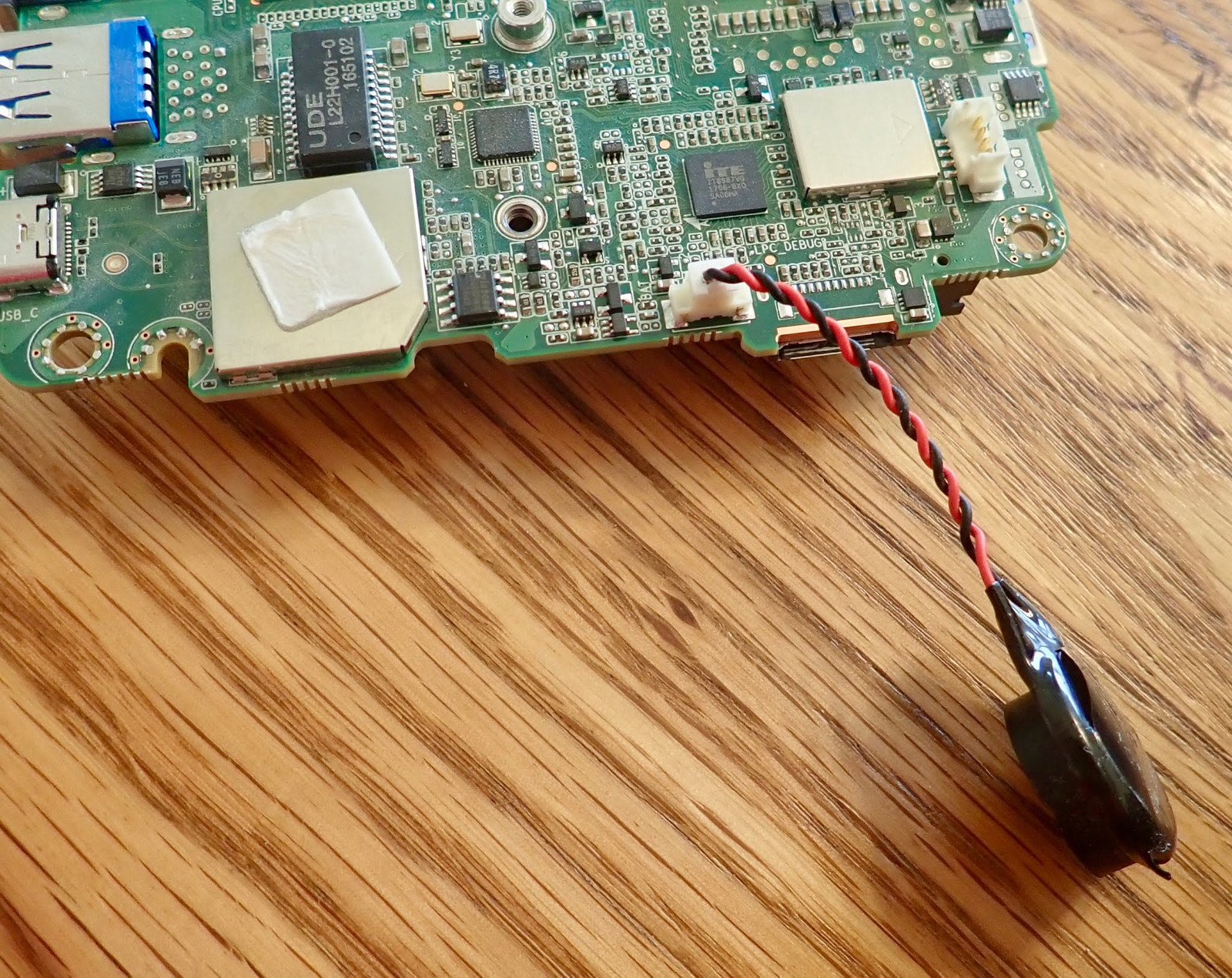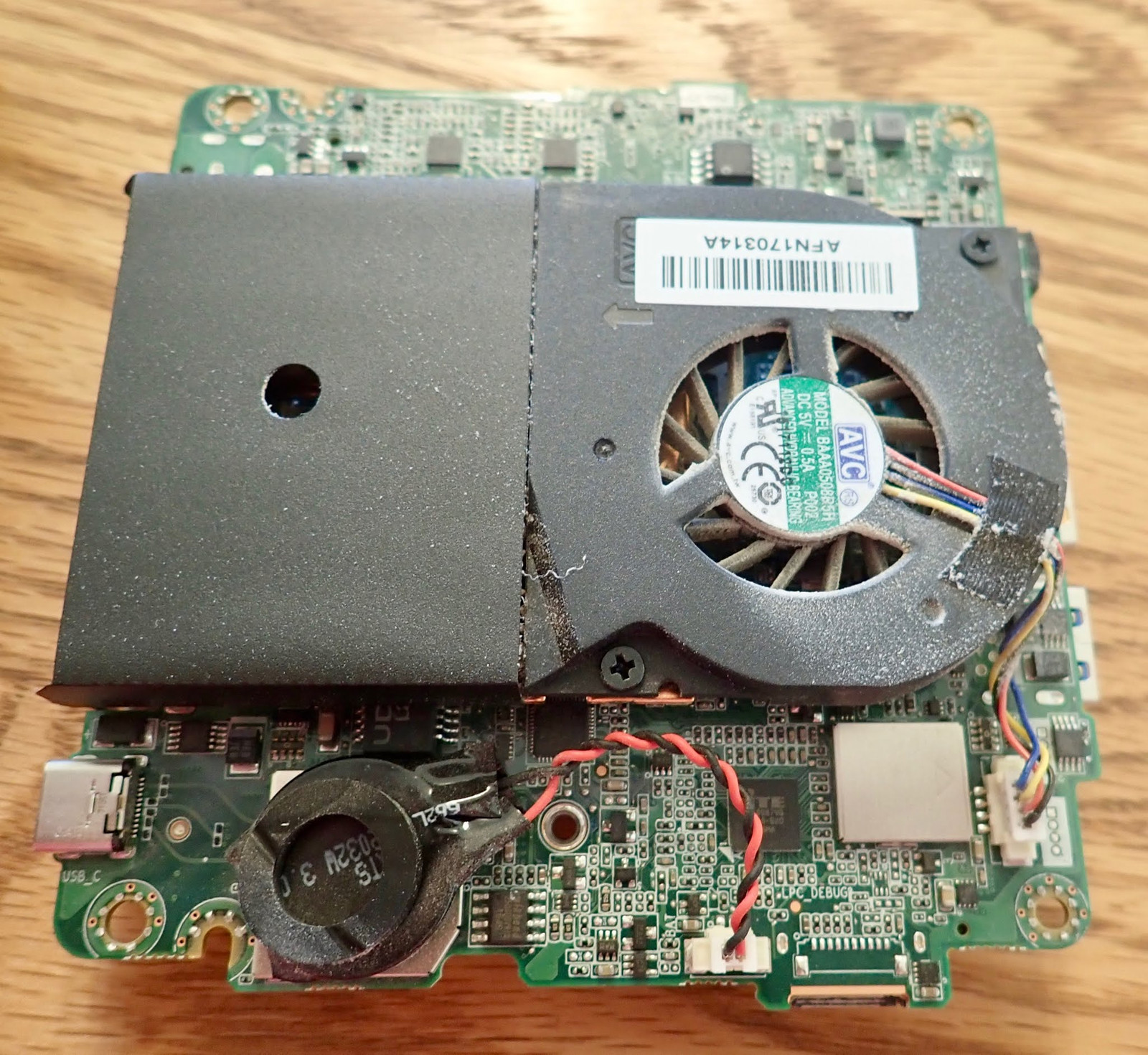 It goes on the SSD! The modern M.2 SSDs run fairly hot, and this serves to couple, through a few layers, the SSD to the top case. I can’t say it would be my first choice of a cooling solution for the SSD, but it works well enough (and is silent). The (fairly thick) aluminum top runs warm in operation, and it’s got a good thermal connection to the main case. It works well enough, and given that I’ve got a lightly loaded system, I’m not highly motivated to change things out.