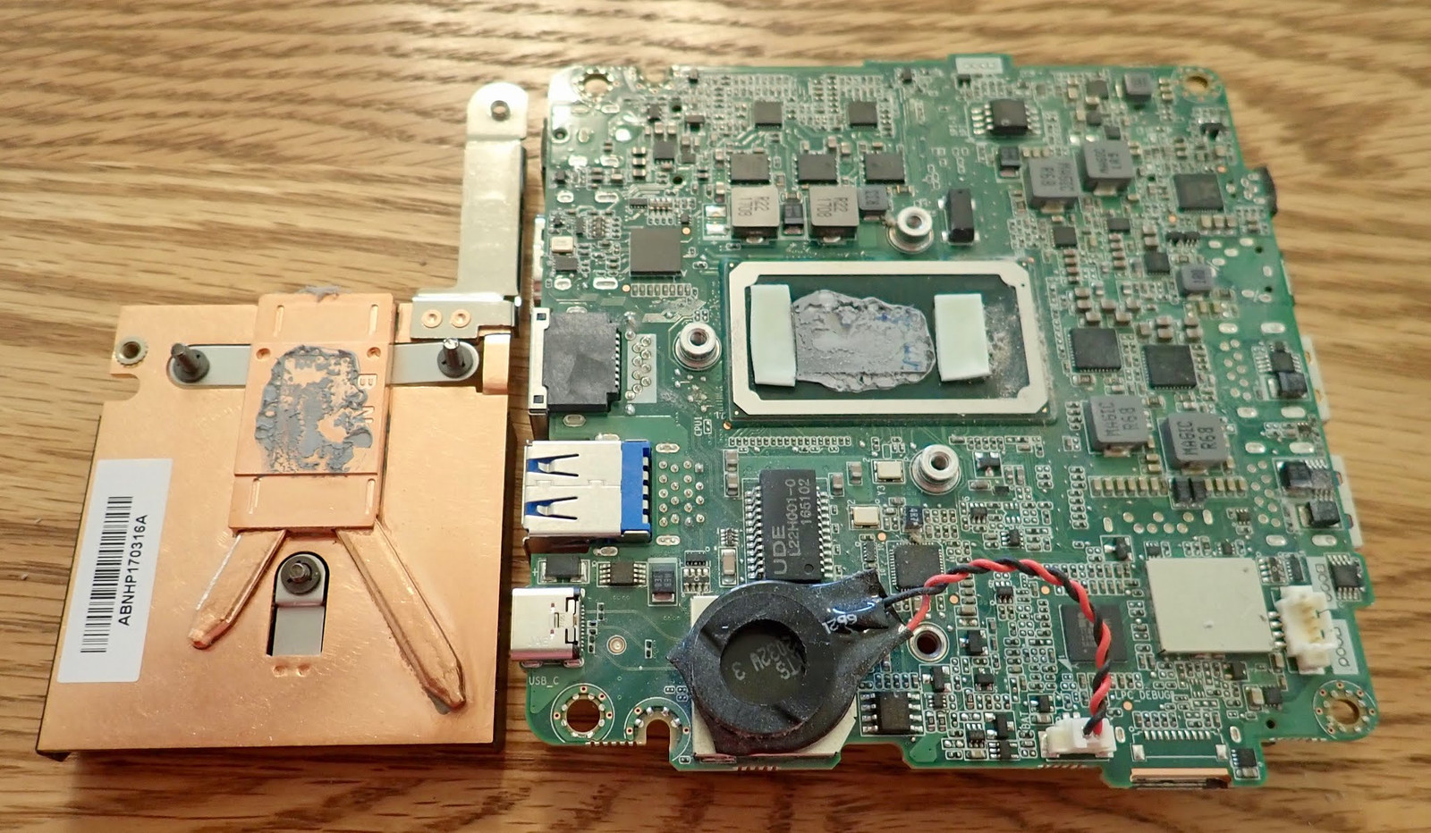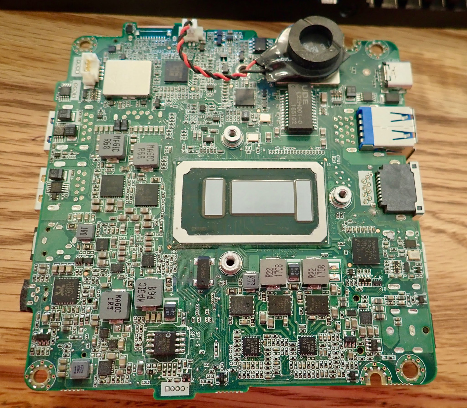 Looking at the bottom of the heatsink, you can see a pair of heatpipes spreading off - nifty! Heatsink design has come a long way from the 90s, when they were just a hunk of metal with some fins cast or milled in it (but, to be fair, processors use an awful lot more power). You can see the processor in the center of the board. This is more than just the CPU - it’s the CPU, GPU, and platform controller hub, all in a tiny bit of silicon!