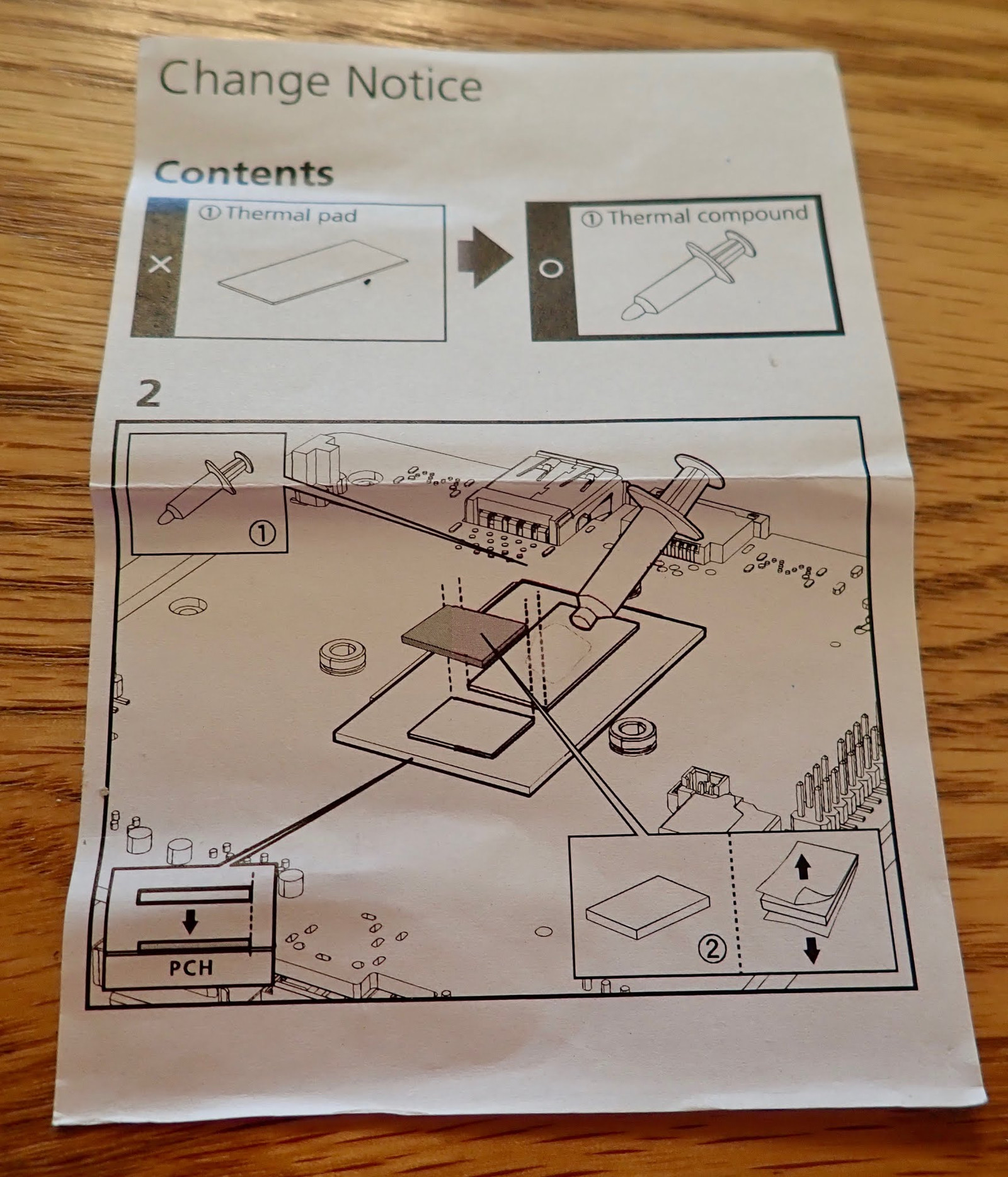 I get the impression this same case has been through a lot of NUC revisions. The main instruction sheet is different on both sides, for different generations of NUC, and there are a few change notices also crammed in the package. At some point they’re going to have to redesign the case - but, for now, they can just keep hacking things forward. Here, they suggest using the new thermal pad on one end of the chip area. Looking at how things line up, the height difference step is right between the two mounting holes for the stock heatsink, so it makes sense.