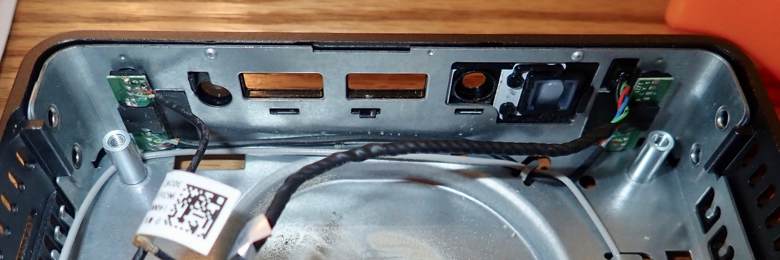 If you want to install the microphones from the stock NUC case into the new X7 case, you can. They just peal off the front of the NUC case, and there’s an extension cable included to let you hook them up to the board. I opted not to move them over, because the only use I have for a microphone on this computer is the occasional video call with family, and my webcam has a microphone. Where the NUC will eventually be mounted won’t be great for room audio either. And, really, I’m sick and tired of absolutely everything listening to me (or having the capability). One less device in the house with a microphone attached is a win.