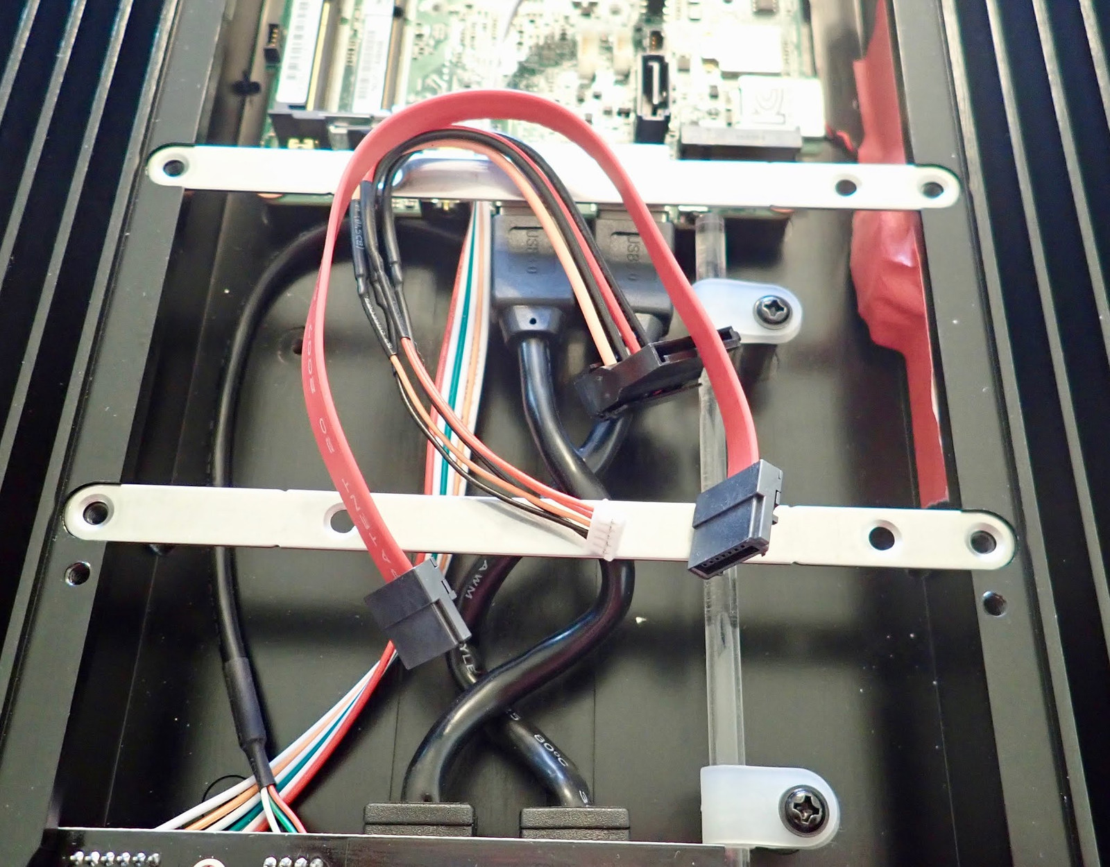 One really nice thing this case includes (that I’m not using) is a set of rails to mount a 2.5” hard drive - along with a short SATA cable and the goofy little power adapter required to run one from a NUC. If you were doing something that required bulk storage, you could put a big 2.5” spinning drive (or SSD) in this case. I might consider a large SSD for silence reasons in my use case - but, it doesn’t matter, because I’m streaming content off a server in the utility room. These rails are safely tucked aside in case I decide I need more local storage for some reason.