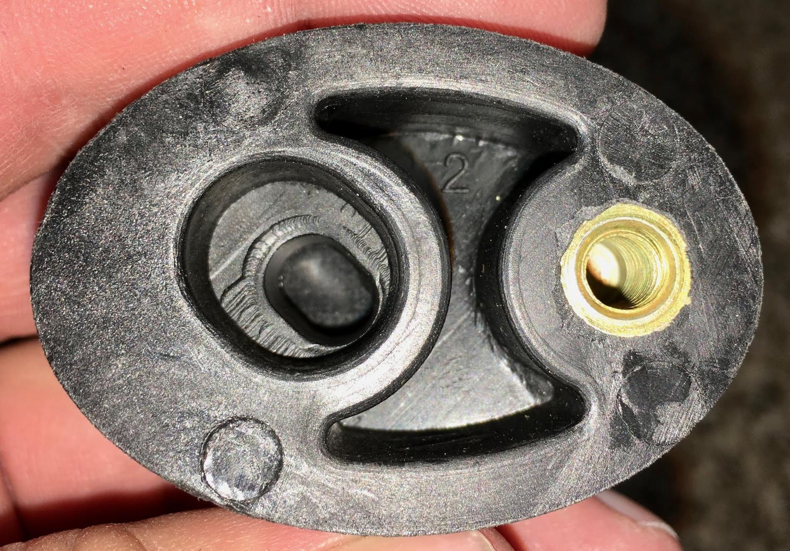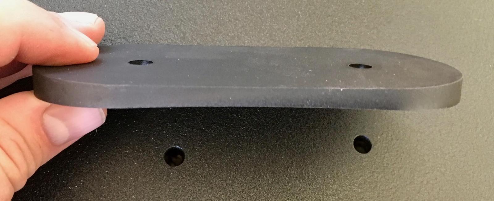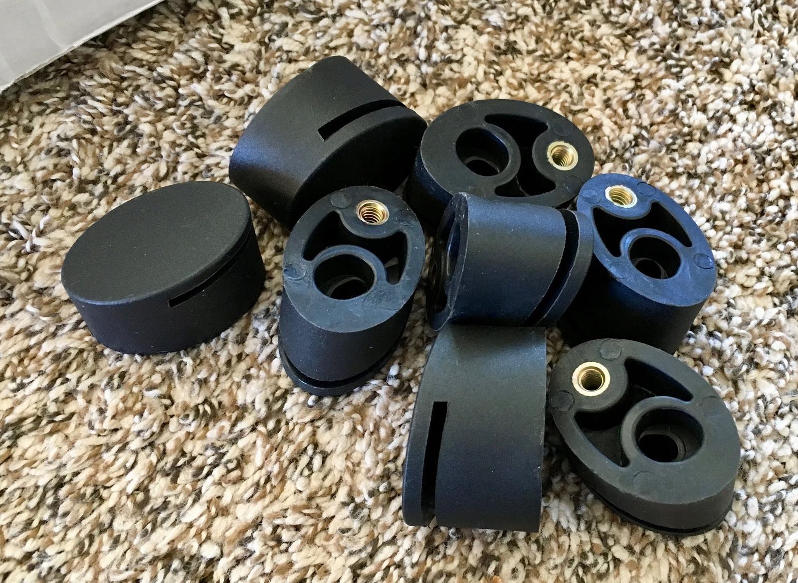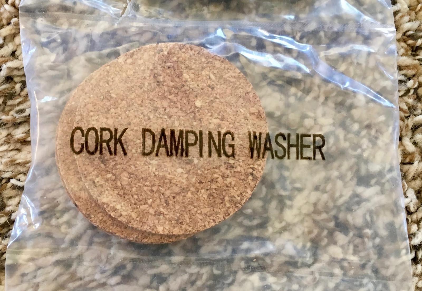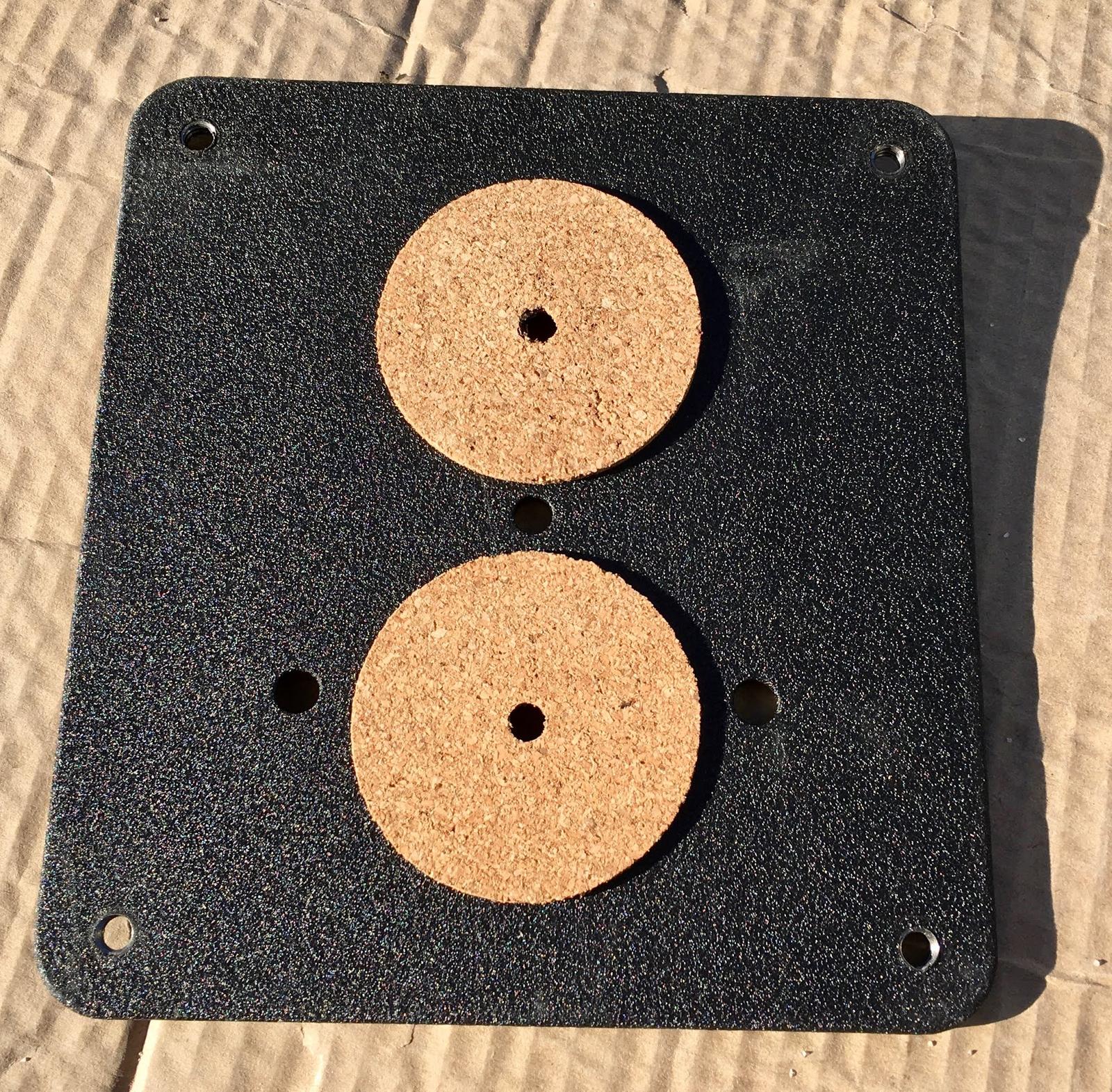 Plus, of course, the top plates. Peal the adhesive off two damping washers and secure them to each top plate. It might help to shove a bolt through the hole to help with alignment, but they’re cork - just get them pretty close and things will fit.