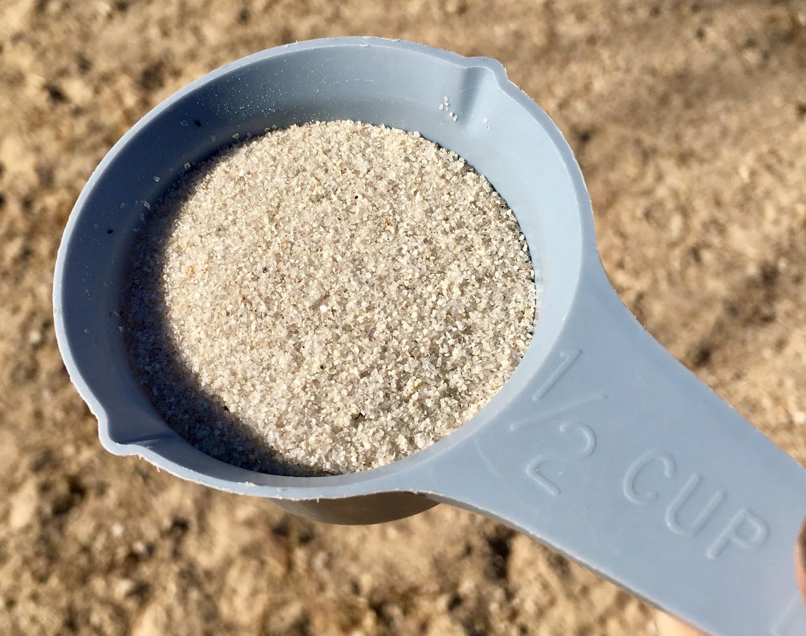 To get an idea of what I’ve filled them with, here’s the quartz in a 1/2 cup measure. You’ll find people expressing concern over silicosis and related diseases if you spend too much time researching speaker fill material, so I’ll make a suggestion: stand upwind. You’re filling some speaker stands, not working in a factory that grinds the stuff. Try not to breathe it, but I see no reason to worry about it to the level that some people feel the need to.