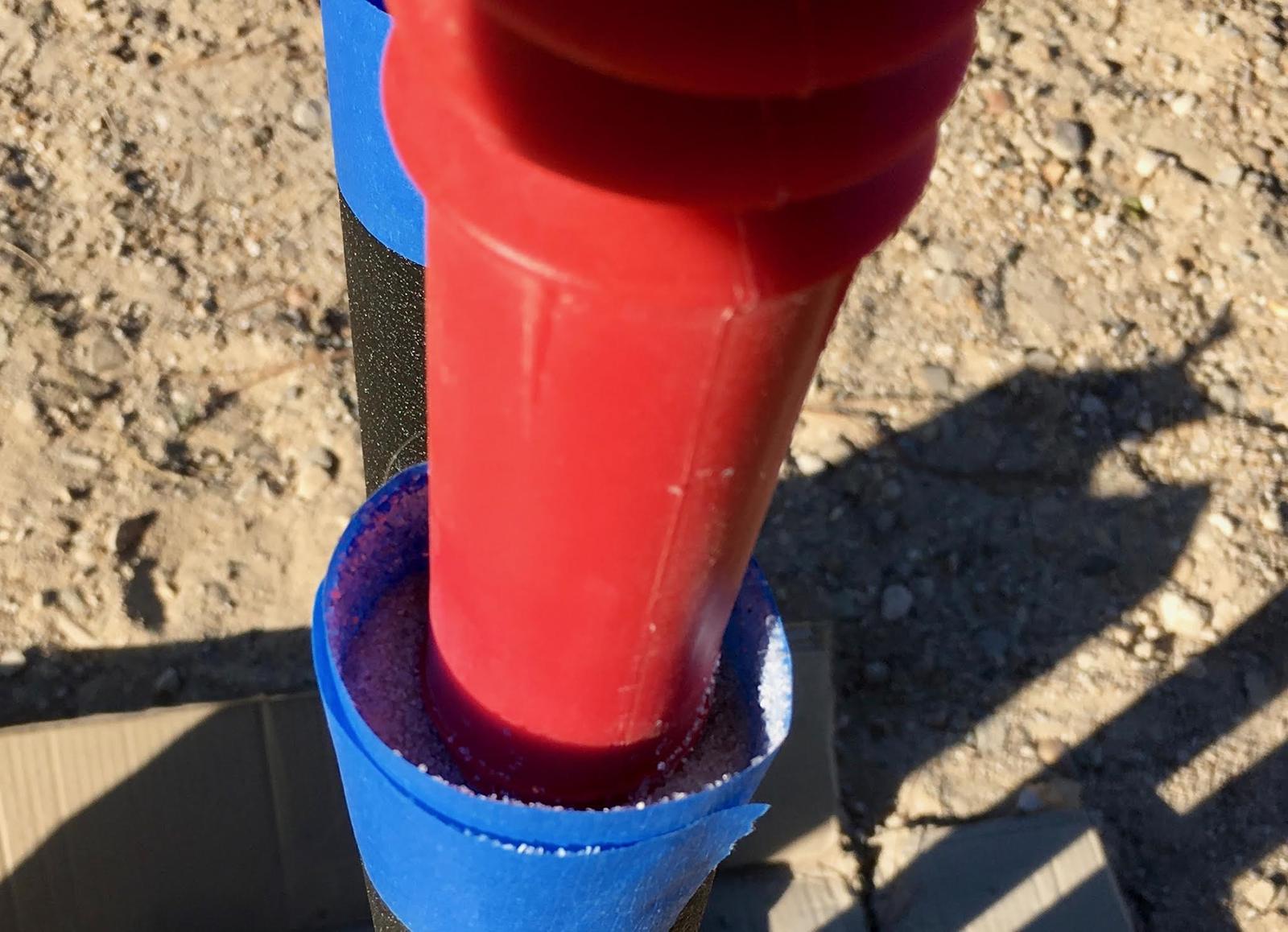 Get some masking tape (2” wide is ideal, or wider if you can find it), and make a couple wraps around the top of each upright. This will help hold the material in as it flows down. The tubes will self fill with any reasonably dry, small granule material, so you shouldn’t have to do a lot of wiggling/pounding except at the very end.